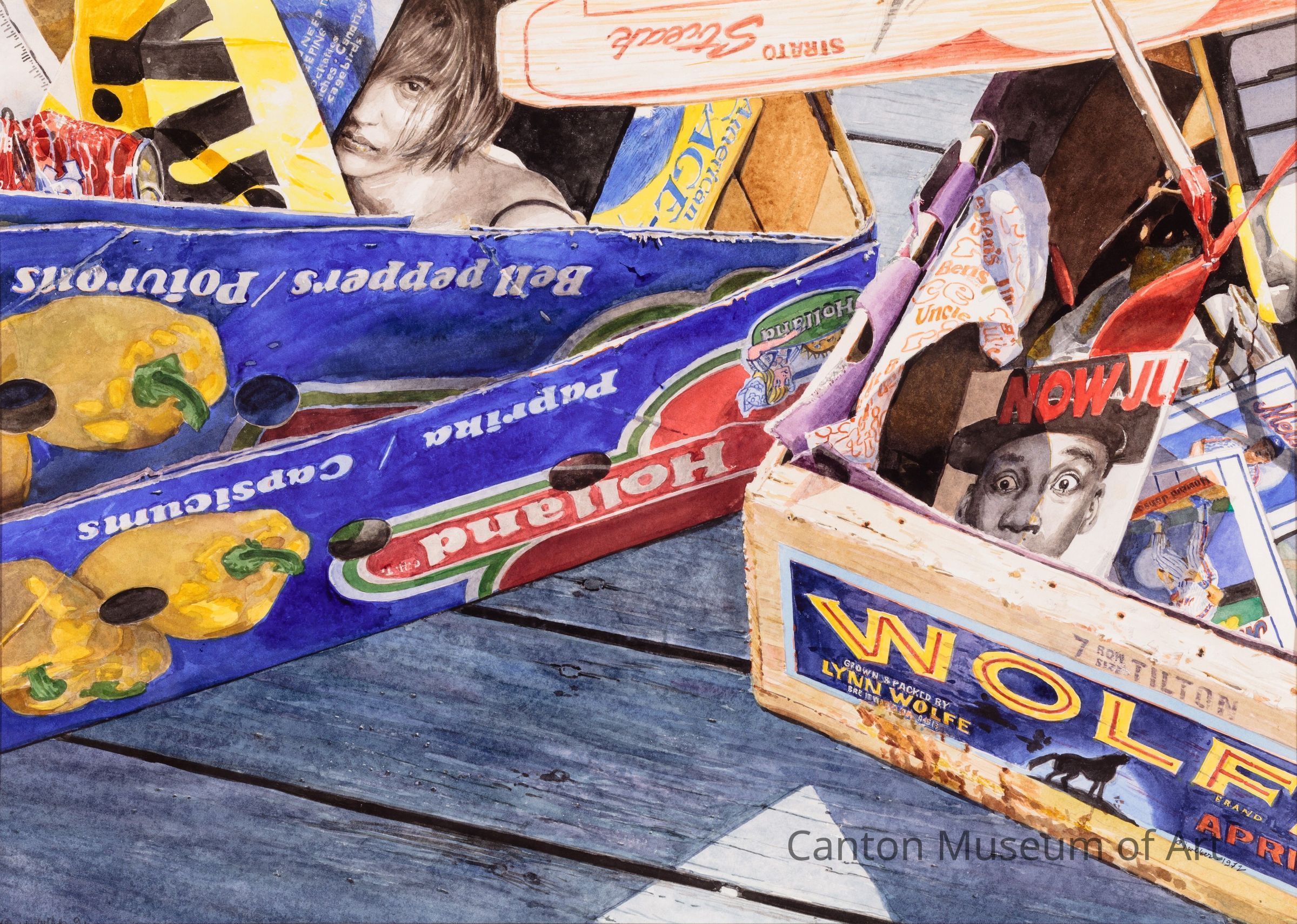 Like each one of her photorealist trash paintings, “East End - Wolf” is painted in painstaking detail. The edges of the Holland boxes are visibly worn, their sides creased. The partial portrait of the woman in the box captures each single strand of hair on her head as well as haggard lines on her face. The closely-cropped aerial vantage point forces us to look directly down onto the scene, confronting the items we tend to disregard — soda pop cans, mail, food wrappers. Weber boldly defied the notion that still lifes had to be idealized depictions of objects of value. Rather, the objects chosen could be the everyday discarded ones that we ignore, worthy of exploring closely and regarding as beautiful. Through her work, Weber challenged viewers to reconsider their relationship with everyday objects.