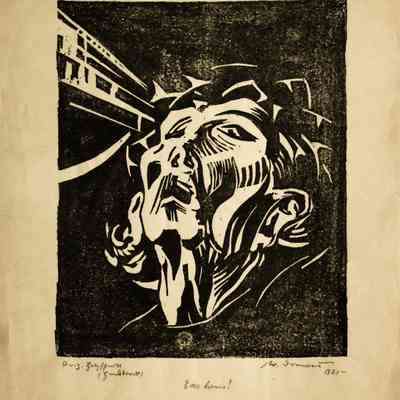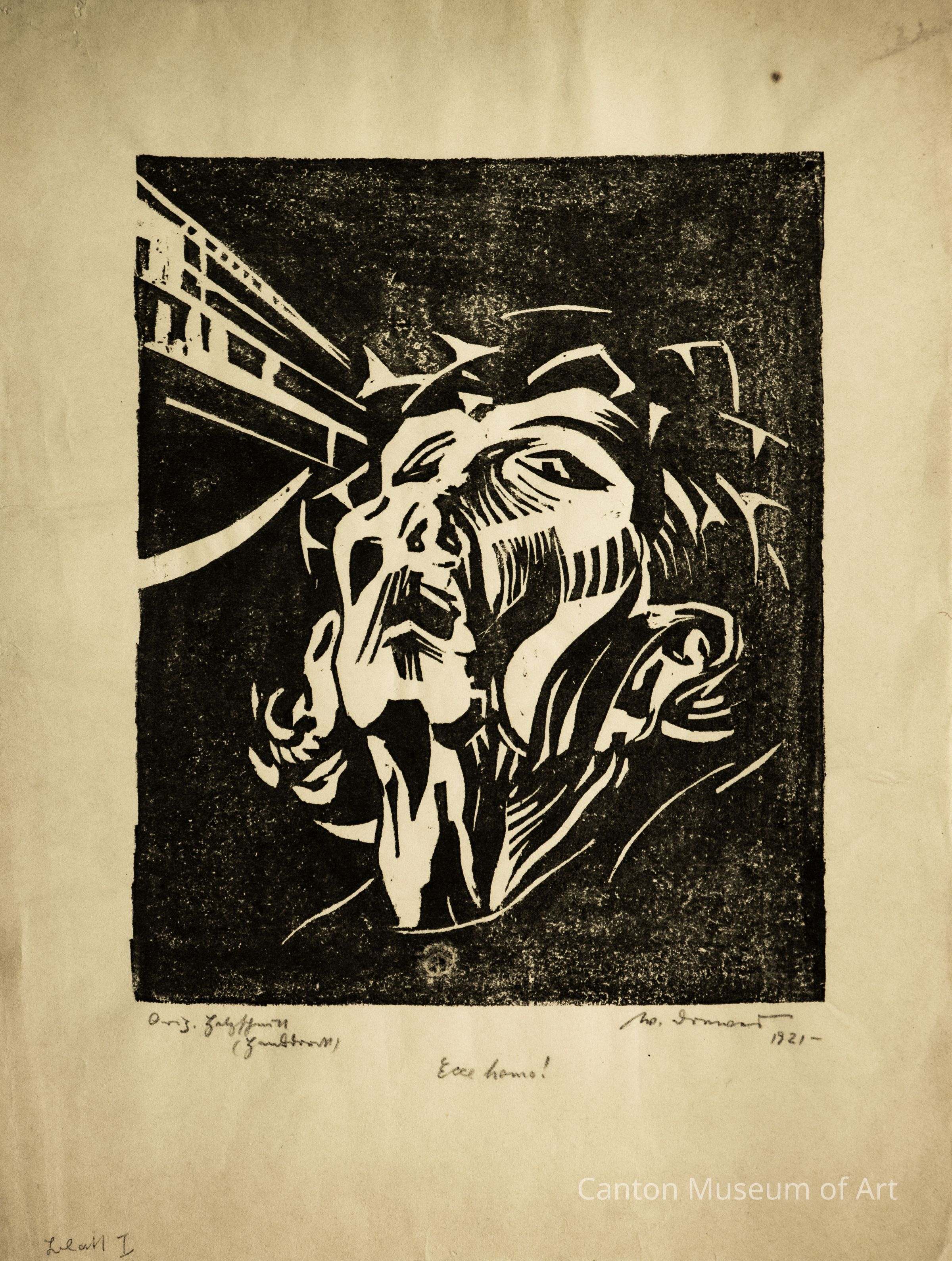 During the 1920s, Werner Drewes studied at the Bauhaus (Weimar) in Germany with various artists, including Lyonel Feininger who taught him to make woodblock prints. While at the Bauhaus, Drewes produced a portfolio of ten woodblock prints that explored the religious theme of Pontius Pilate's presentation of Jesus Christ to a hostile crowd ahead of his crucifixion. Titled "Ecce Homo," Latin for "Behold the Man," these were the words that Pilate spoke to the crowd after he witnessed Jesus's suffering and advocated for his release. "Ecce Homo I" is the first in the series of ten. Drewes' thematic choice for this series was influenced by his upbringing as the son of a Lutheran minister, who impacted Drewes' life outlook.