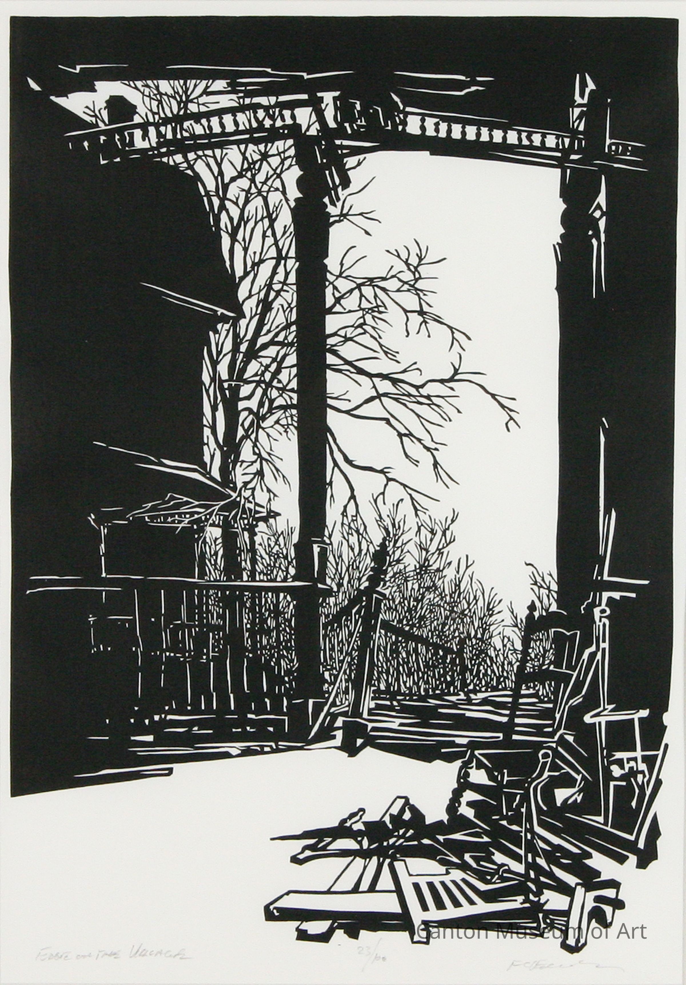 While serving in the Air Force, Eckmair was stationed in Korea, often traveling to Japan to hike, where he came across the art of wood cutting and became interested in it. Considered a master of the woodcut, Eckmair created haunting works evoking rural life in upstate New York. Most of his prints are a patchwork of items, houses, and landscapes from Gilbertsville, New York, where he grew up. Eckmair’s distinctive regionalist woodcuts became widely known through his affiliation with Associated American Artists (AAA) of New York. AAA was a program founded to market affordable fine art prints to the American public. Like earlier artists such as Grant Wood, John Steuart Curry, and Thomas Hart Benton, Eckmair created prints of regional landscapes for AAA that had great populist appeal. Eckmair’s woodcuts are unique for their use of white space, which was important to the artist. He purposely didn’t include people in his work, and called his pieces “lonesome places.”