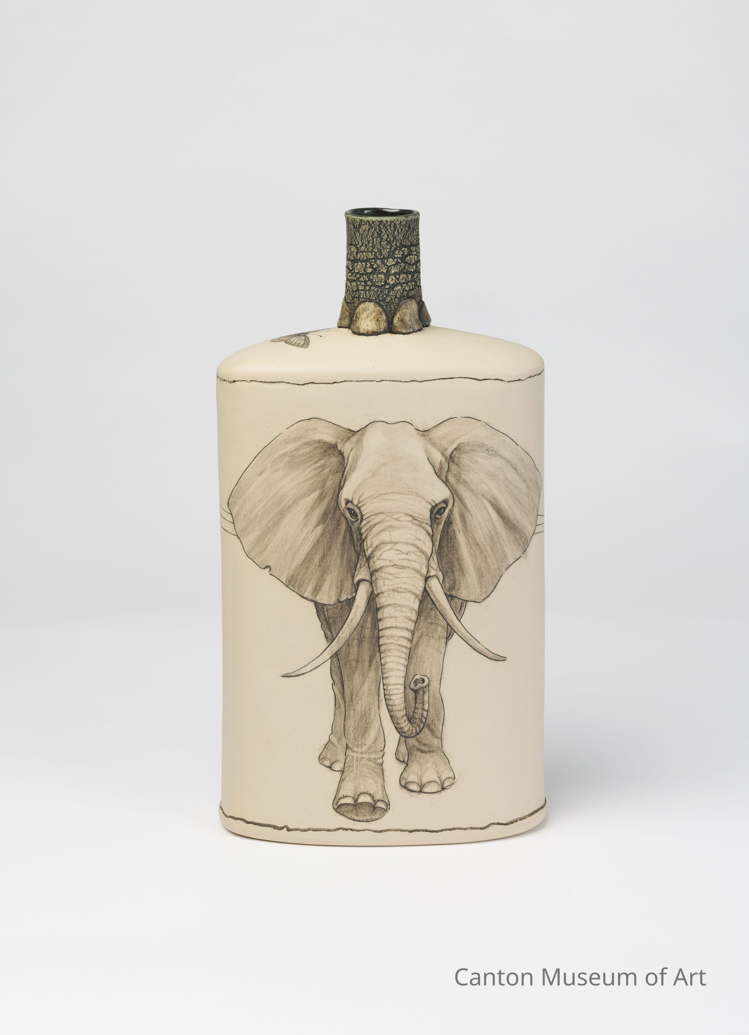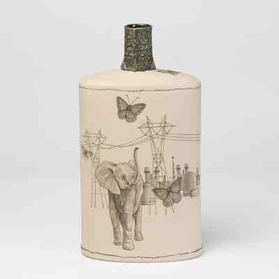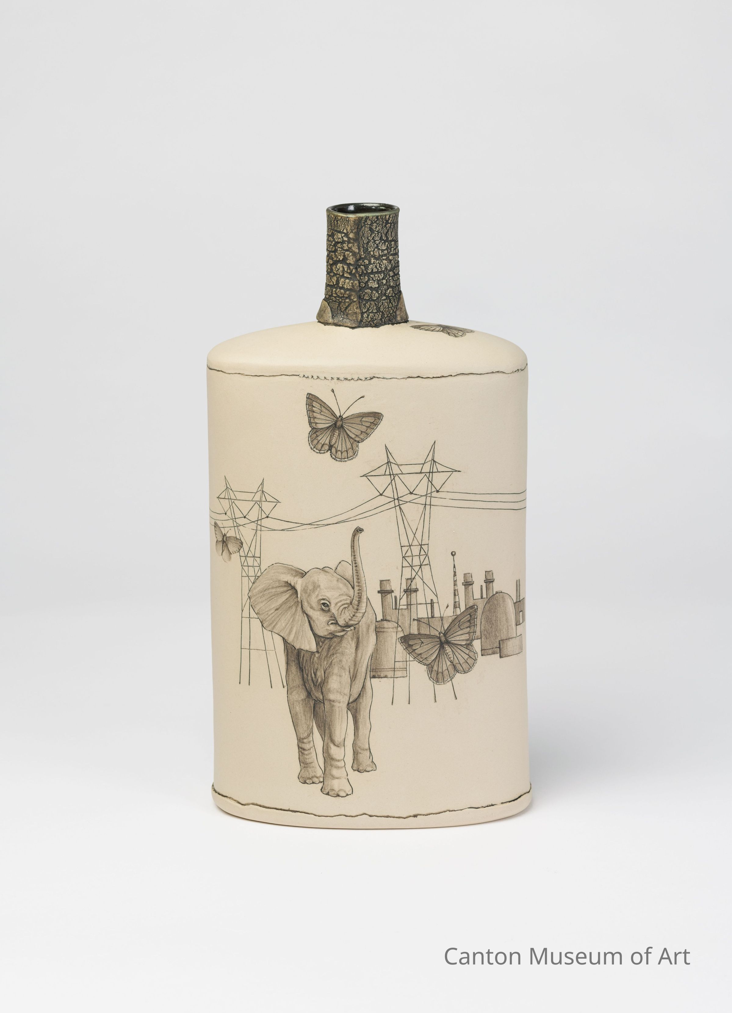 "Eight years ago I changed the way I fire my work from fuel to electricity in order to shrink the carbon footprint of my studio practice, and drawings began to appear on the pieces. I realized I was talking about something, telling a story. When I begin a drawing I have a vague plan for what I intend, but mostly I let the images take the lead and reveal their meanings in the hope that each piece will become its own little world. I’m always ready for a surprise.