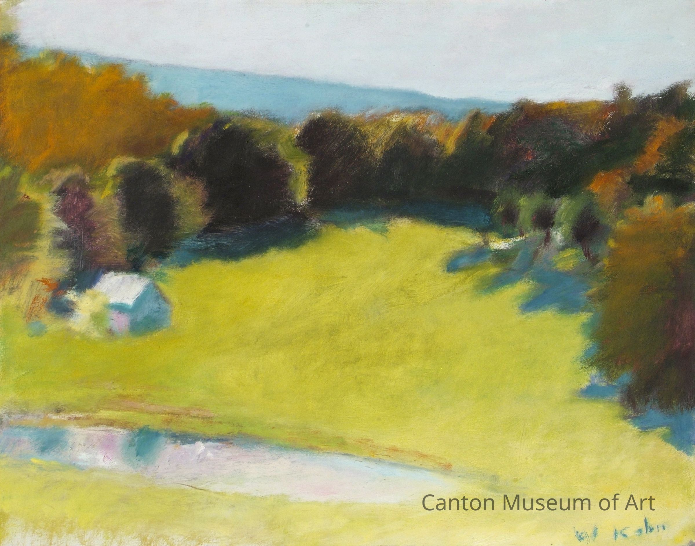 One of Kahn's primary focuses in his art, which was encouraged by plein air painting, was the effect of light on a landscape, seen in "Evening Meadow," where Kahn depicted the bright sun hitting the field and casting dramatic shadows from the surrounding trees. In 1968, Kahn purchased a farmhouse in West Brattleboro, Vermont where he spent every summer painting with his artist friends in the area. Although this composition is a bit of an abstraction, it is a rendering of the farm in West Brattleboro, which is still in the Kahn family.