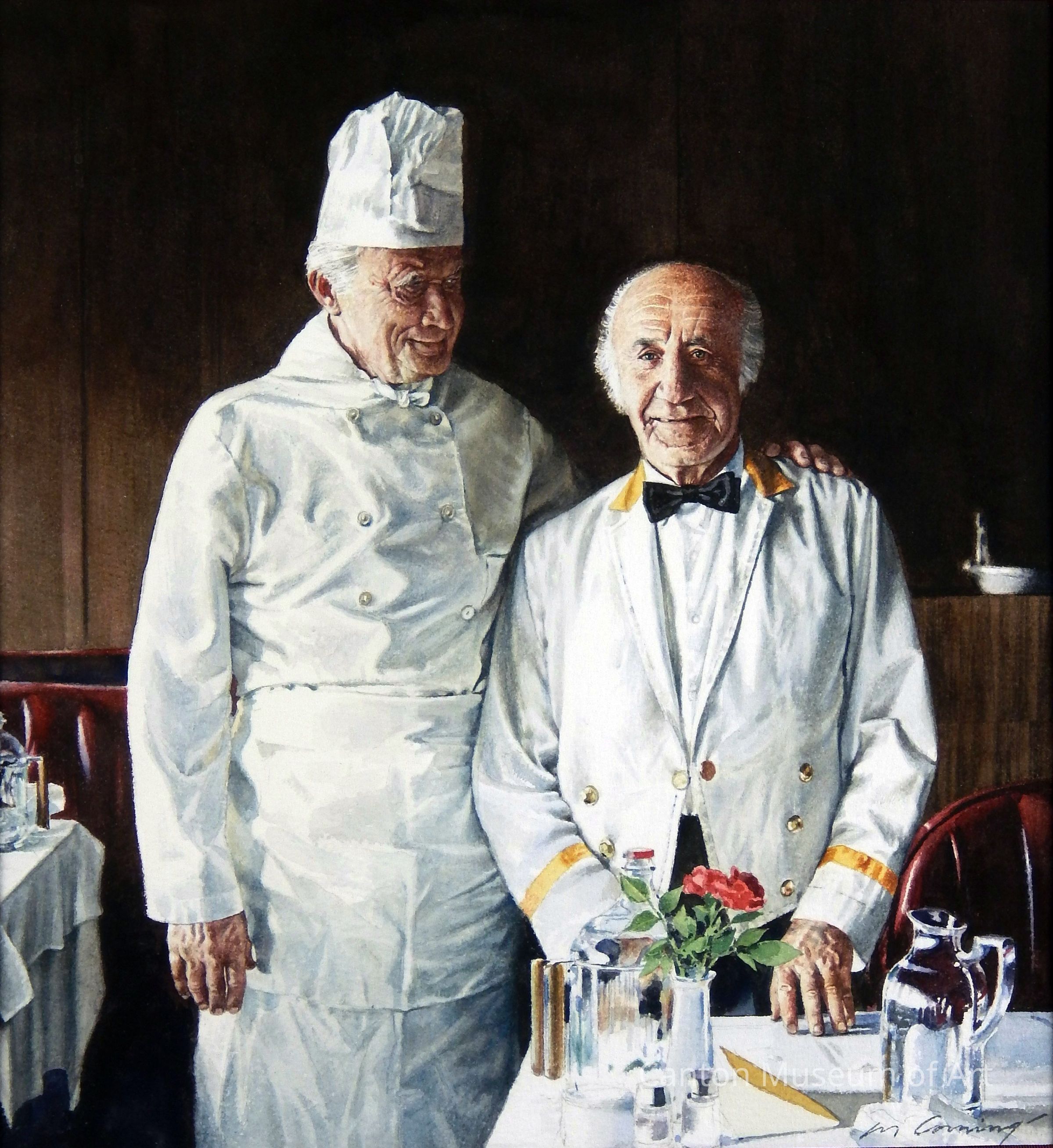 "This small painting was a gift for my wife Tula, probably for an anniversary. What a cheapskate. We met the two subjects at a great restaurant, Lubachs, in San Diego. We always stopped there for lunch during our visits to San Diego. It seemed like such a special treat. A couple of Manhattans, crab salad for Tula, and a nice New York cut steak for me. In those days the waiter would make your salad at the table and the baker would roll out the dessert cart after lunch. What a time."