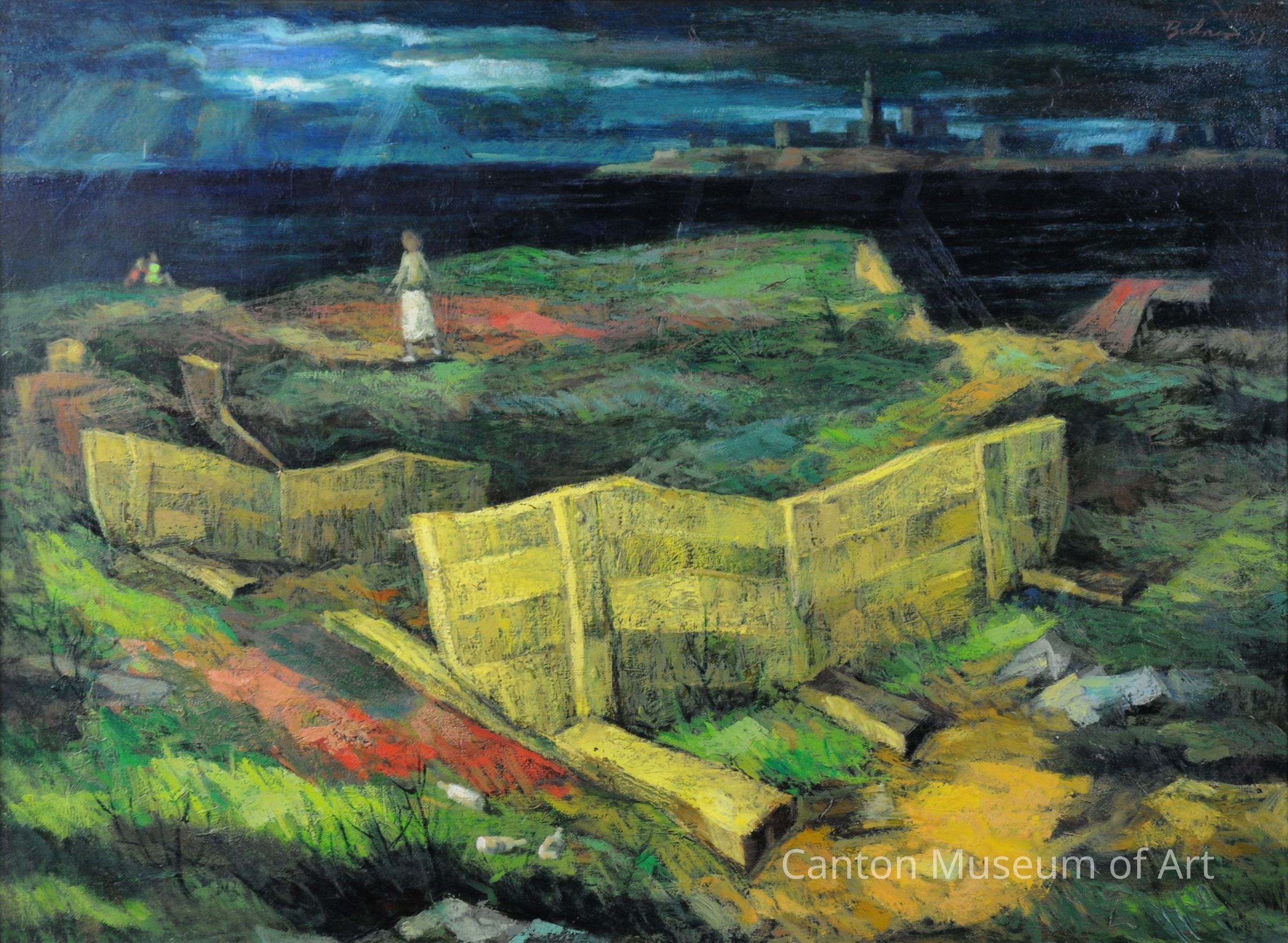 “Wisky Island” was the purchase award winner for the 1951 Fall Show at the Canton Art Institute (Canton Museum of Art). The correct spelling is “Whiskey Island”, named for a location in Cleveland Ohio. However, our records show that the artist intentionally spelled “Wisky” in this manner. He won this prize when he was just 19 years old.