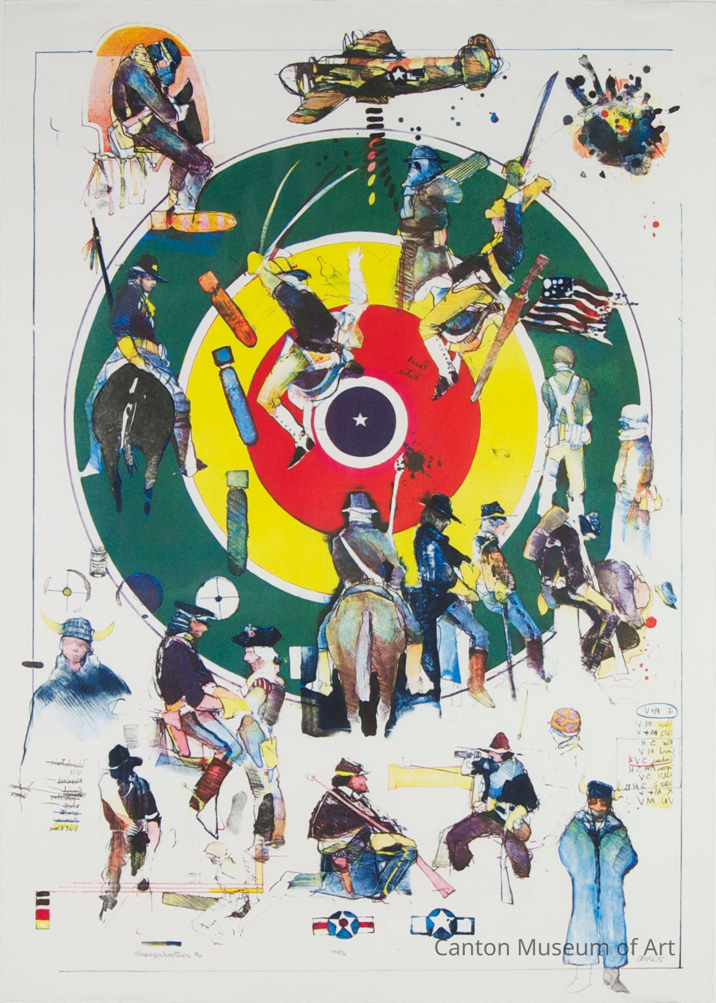 John Lawrence Doyle was known for his lithographs reflecting his fascination with the human condition. For over a decade, Doyle studied ethnology and anthropology. Directly after the end of the Vietnam War, and in anticipation of the U.S. Bicentennial in 1976, Doyle created a series of 11 lithographs - "Sharpshooters 76;" which presented soldiers from wars of America’s past in chronological order. “I wanted to do something that people at the time didn’t particularly want to deal with — war. Particularly, coming so close to the end of the Vietnam era. Folks just sort of wanted to forget it. I also wanted to show that the history of this country is a rather bloody affair, a war every twenty years or so. Courageous no doubt, but dehumanizing nonetheless. This dehumanizing process is what I hoped to show through the evolution of the wars, from the somewhat gentlemanly conducted affair of the Revolution to the dehumanized slaughter of Vietnam.”