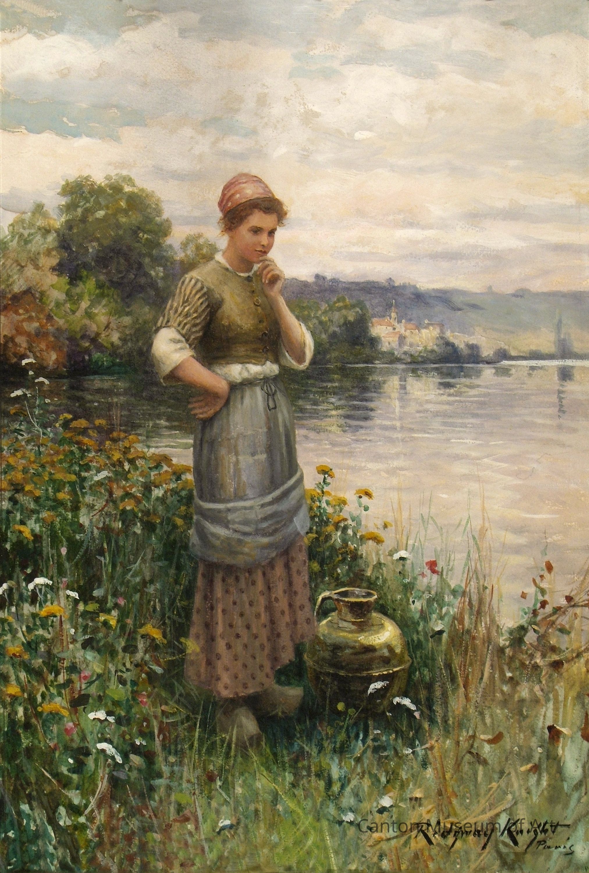 Knight focused on depicting the rural classes during their happier moments. His works during the 1870s and 1880s portrayed the peasant at work in the fields or doing the day’s chores — collecting water or washing clothes at the riverside. By the mid-1890s, he established a home in Rolleboise, France, near Paris. Here he began to paint scenes that would make his work sought after by collectors — views of his garden, with women featured among the blooming flowers. Knight’s home had a garden terrace that overlooked the Seine River — a view he often used in his paintings.