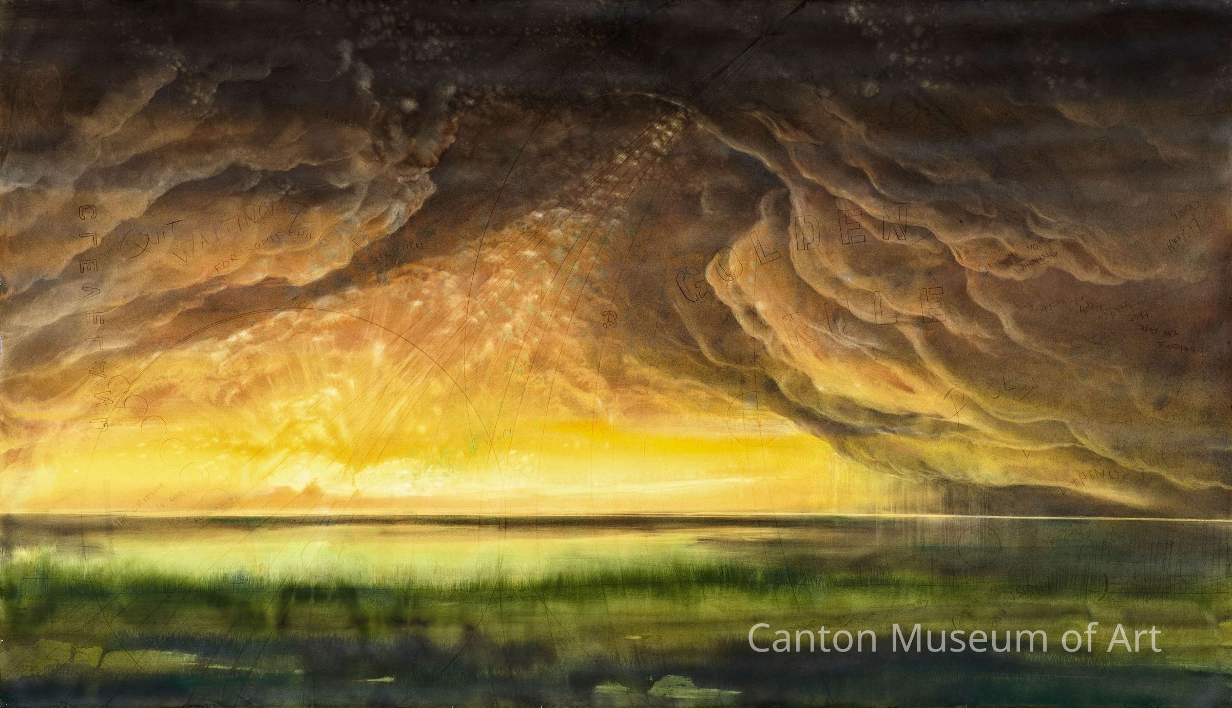 In Judith’s work, you will see a union of nature and emotion, and Golden Rule is no exception. In Golden Rule, ominous storm clouds crowd the top of the painting, only to break apart by a glowing path of golden light which illuminates the ground below it. Various words are incised over the piece, such as “Quit waiting for something to happen,” “You won’t ever be the same as yesterday,” and “The other side is love,” among others. Some are well-hidden, others are easily visible.
