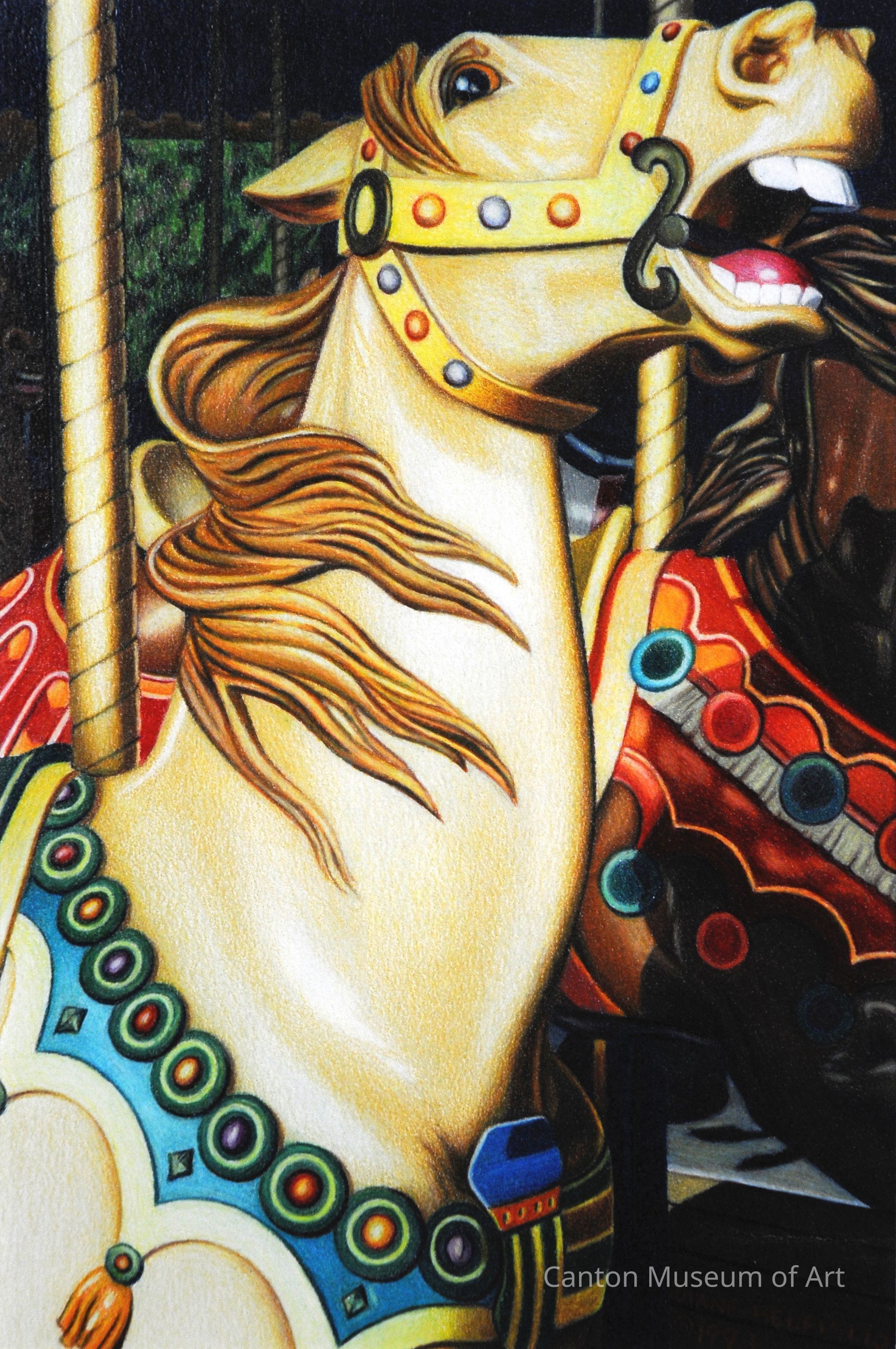 Originally, I painted my first carousel images. But painting became too time consuming after my daughter was born in 1992. Drawings were more practical because they could be easily interrupted when the children needed attention. Illions Horse VI is one in a series of twelve drawings done from the Marcus Illions carousel at Geauga Lake. (Geauga Lake has since closed and the carousel was moved to Worlds of Fun in Kansas City, Missouri, in 2007.) In these pieces, I carried over the intense sunlight and cropping techniques of my architectural work because it increased the psychological tensions of the subjects.