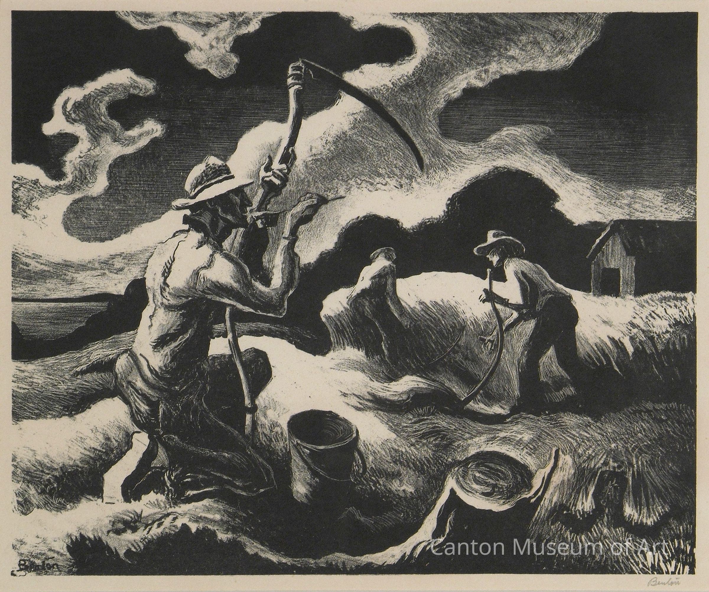 The majority of Benton’s lithographs were derived from his paintings and drawings, and "Island Hay" is no exception. After appearing on the cover of "TIME" magazine in 1934, Benton was approached by a fine art publishing company - Associated American Artists (AAA) - which published prints of the American scene to provide affordable art to people who may not be able to afford it otherwise. Benton painted a total of two versions of "Island Hay" in 1945 in preparation for this lithograph published by AAA. Benton was associated with AAA for most of his lithographs, and he was fairly well-involved with the process, drawing the lithograph and working with the lithographer to create the image.