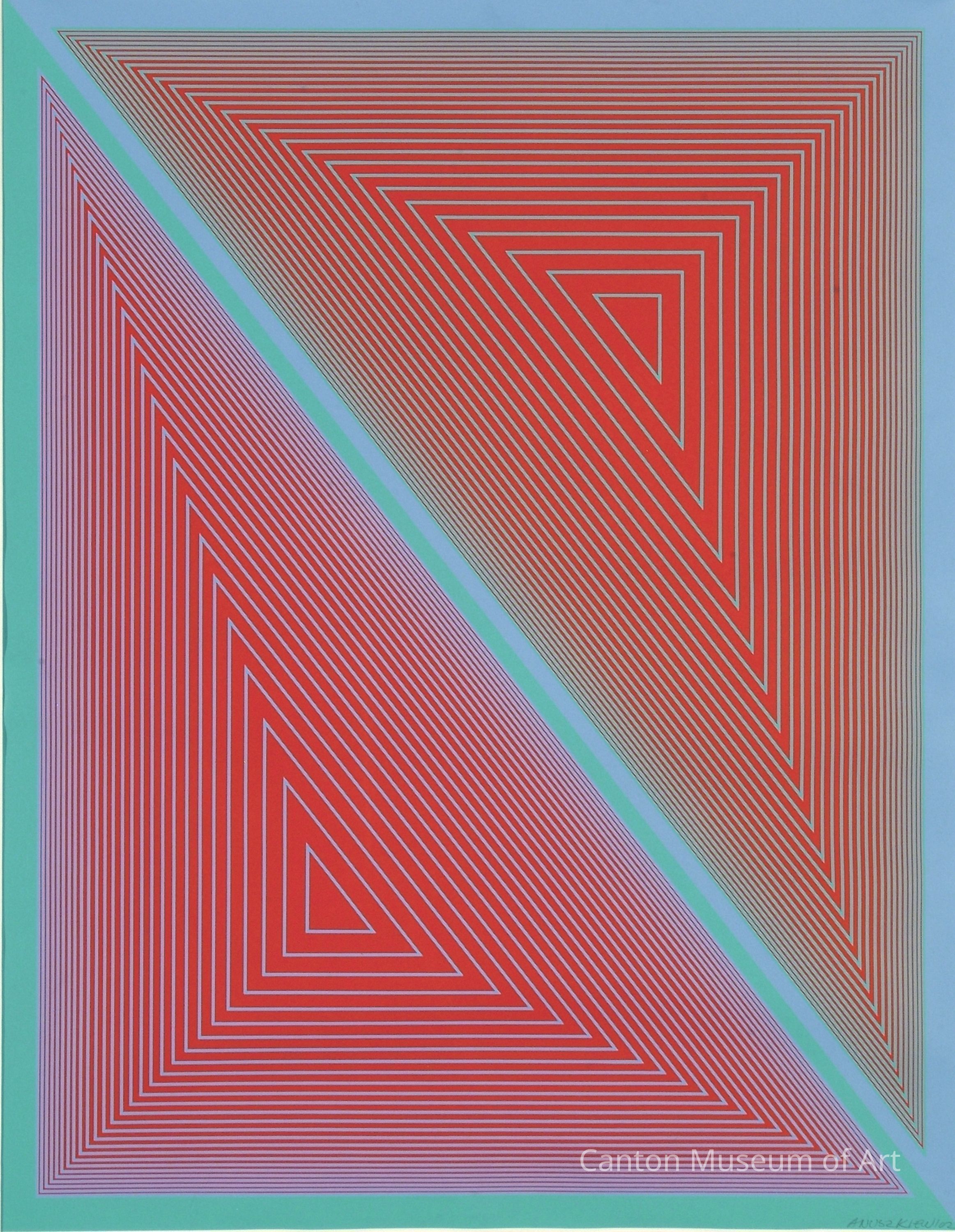 "Led to Believe," depicted here, is one of ten optical screenprints from a portfolio by Anuszkiewicz that he titled "Inward Eye." Anuszkiewicz created the "Inward Eye" portfolio in 1970 after a friend told him that his work reminded him of the 18th century poet and artist William Blake. Anuszkiewicz felt a connection to Blake, a man whose sentiments mirrored his own, possessing a scientific approach while still conveying feelings. With names like "Burning Bright," "Divine Body," and "Sun’s Light," the pieces from Anuszkiewicz’s "Inward Eye" portfolio challenge viewers to gaze upon them to “hold infinity in the palm of your hand,” in the words of Blake. Each of the ten serigraphs in "Inward Eye" contain two excerpts from Blake’s writings. Anuszkiewicz selected texts that support Blake’s core belief that human beings achieve divinity when released from their limitations.