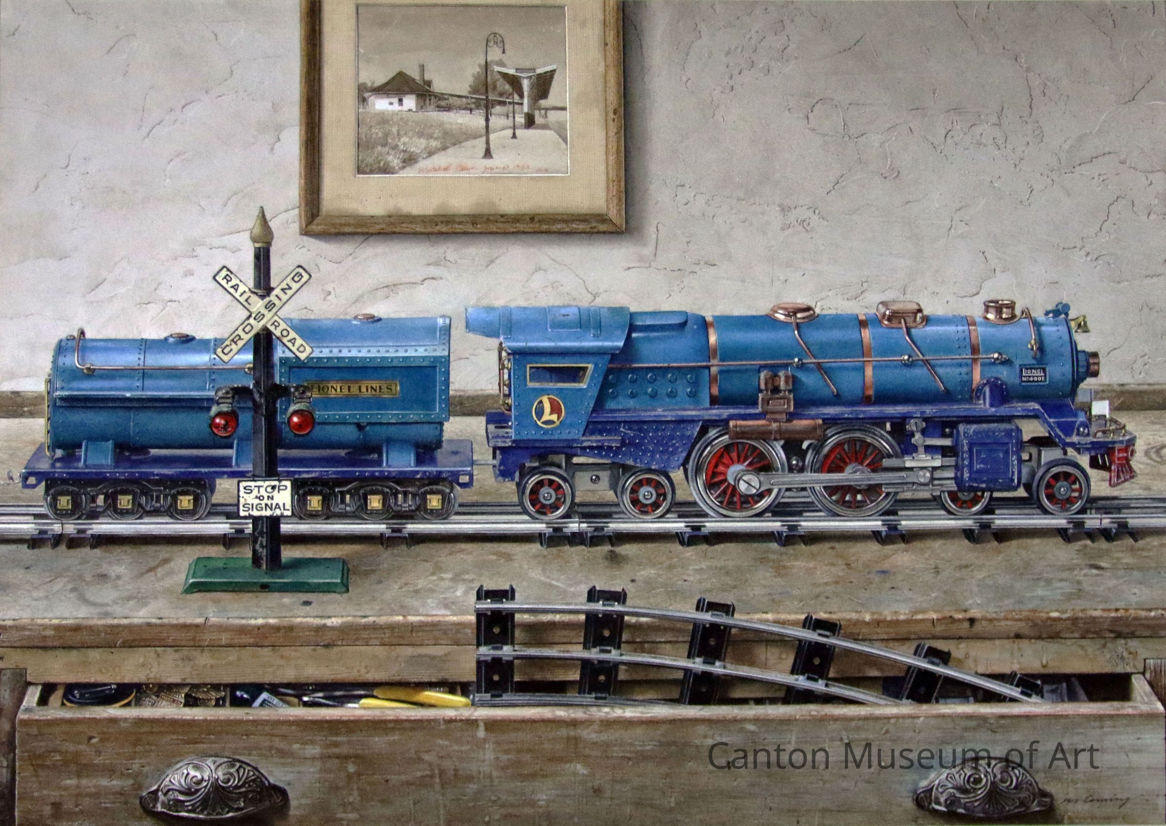 This painting features the Blue Comet toy train in its actual size and is one of Lionel's most collectible trains. The Blue Comet was made in the 1930s, fashioned after New Jersey Central's luxury coach service that ran between New York and Atlantic City from 1929 to 1941. The train station depicted in the painting - Whitehall Station - was one of the stops in New York.