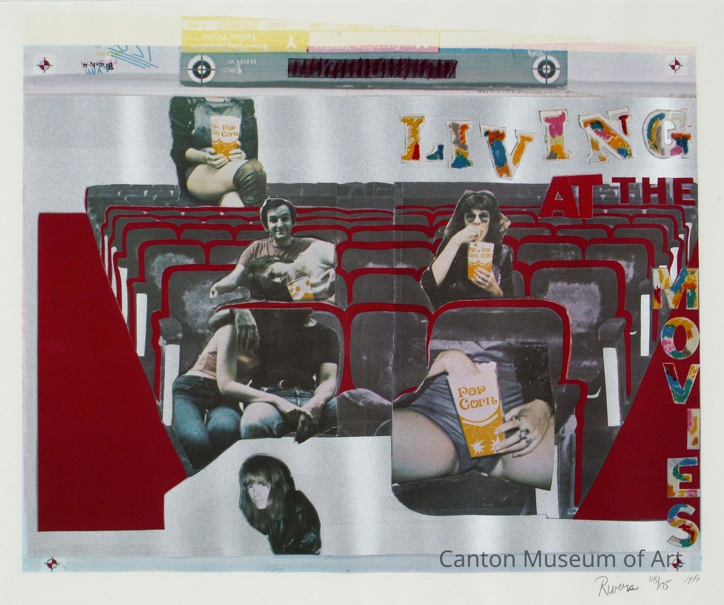 In this work, photographs were collaged onto a painted background of seats in a movie theater - the photographs being of familiar people in Rivers' life, depicted in sexually suggestive manners. He frequently pulled images from mass media, family photographs, and art history books that he could rework with his unique sense of humor. Rivers' son, Steven, is seated in the movie theater with a young woman, perhaps his girlfriend. Rivers' own girlfriend at the time, Diana, is portrayed three times - in the back, middle, and front of the theater, almost as if she is moving. These visuals imply that all of life's activities can, and do, take place in movie theaters. Rivers' work and personality were often unconventional and controversial, and he is considered the "Godfather" of Pop art, influencing its development and artists such as Andy Warhol.