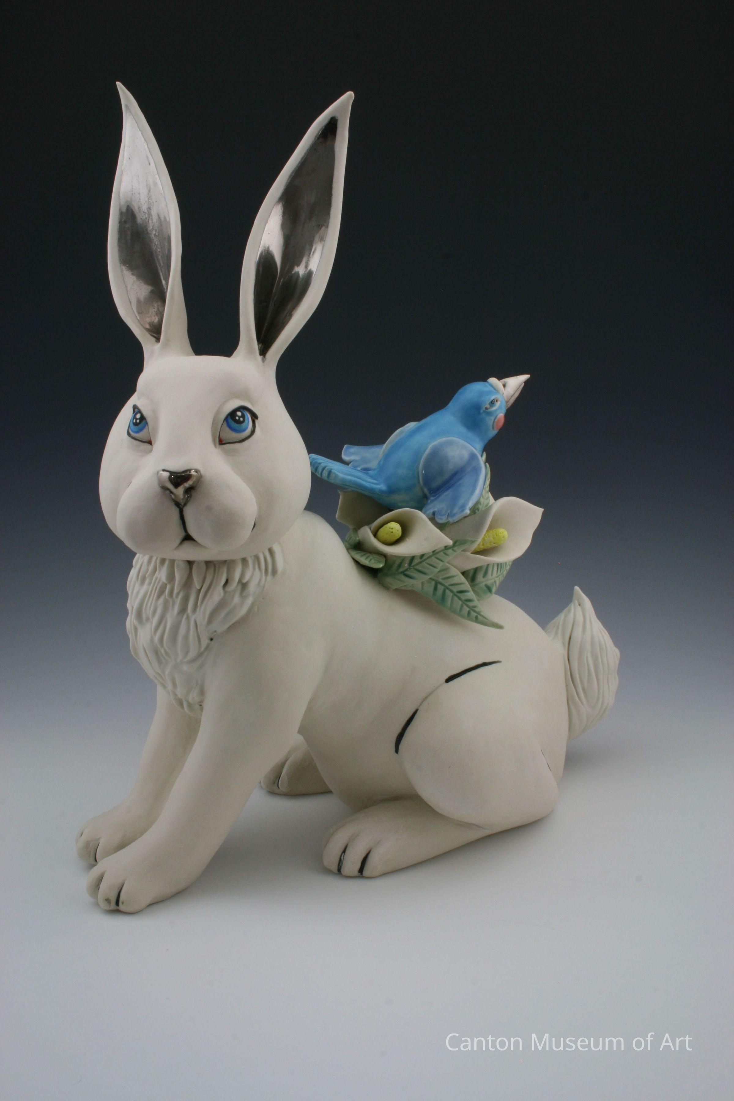 My work is made of porcelain and completely hand built. I began with the body of the rabbit and added the legs, head and ears to the form. After that, I constructed the lilies, leaves, and the bird. I added those separate pieces to the rabbit form. When I was satisfied with the overall design of the various forms, I added more details to them. I covered the piece and let it slowly dry for approximately two weeks. After a bisque firing, I sanded it and began the glazing process. Everything was hand painted and then placed into the kiln for a second firing. The final painting stage was the application of the silver luster, after which the piece was placed in the kiln for its third and final firing."