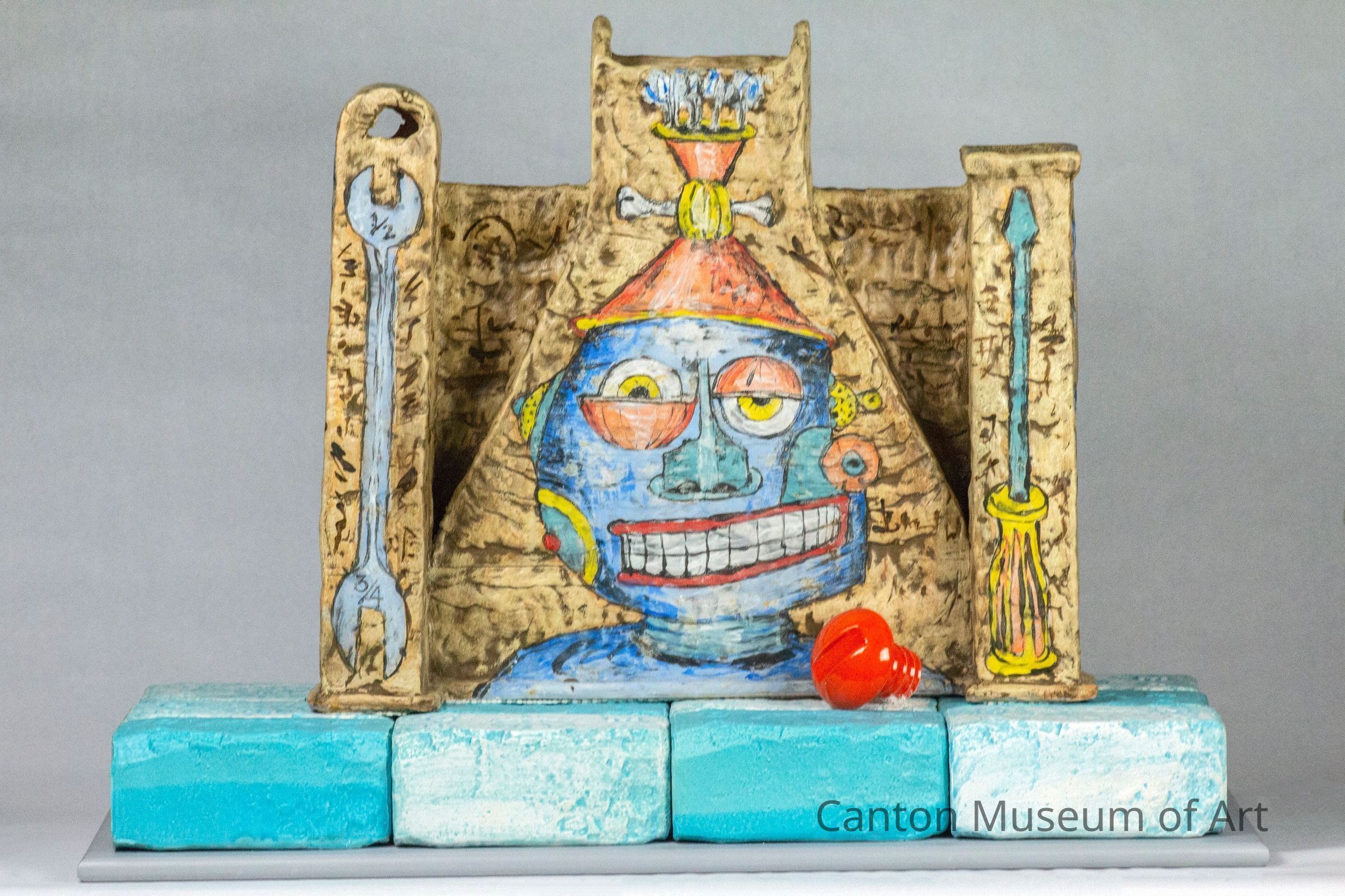 Living and working in the city of Cleveland, I would travel on most days between my work place at the Cleveland Institute of Art to my ceramics studio in Tremont. Tremont is in the old steel-making district. The drive took me past lots of old buildings covered with graffiti. Those memories of abandoned buildings and brick streets are echoed in the forms and images used in this work. The brick base is made from molds taken from Cleveland street paving bricks. One of the bricks is stamped "Canton," in honor of Canton's major brick maker, The Belden Brick Company.