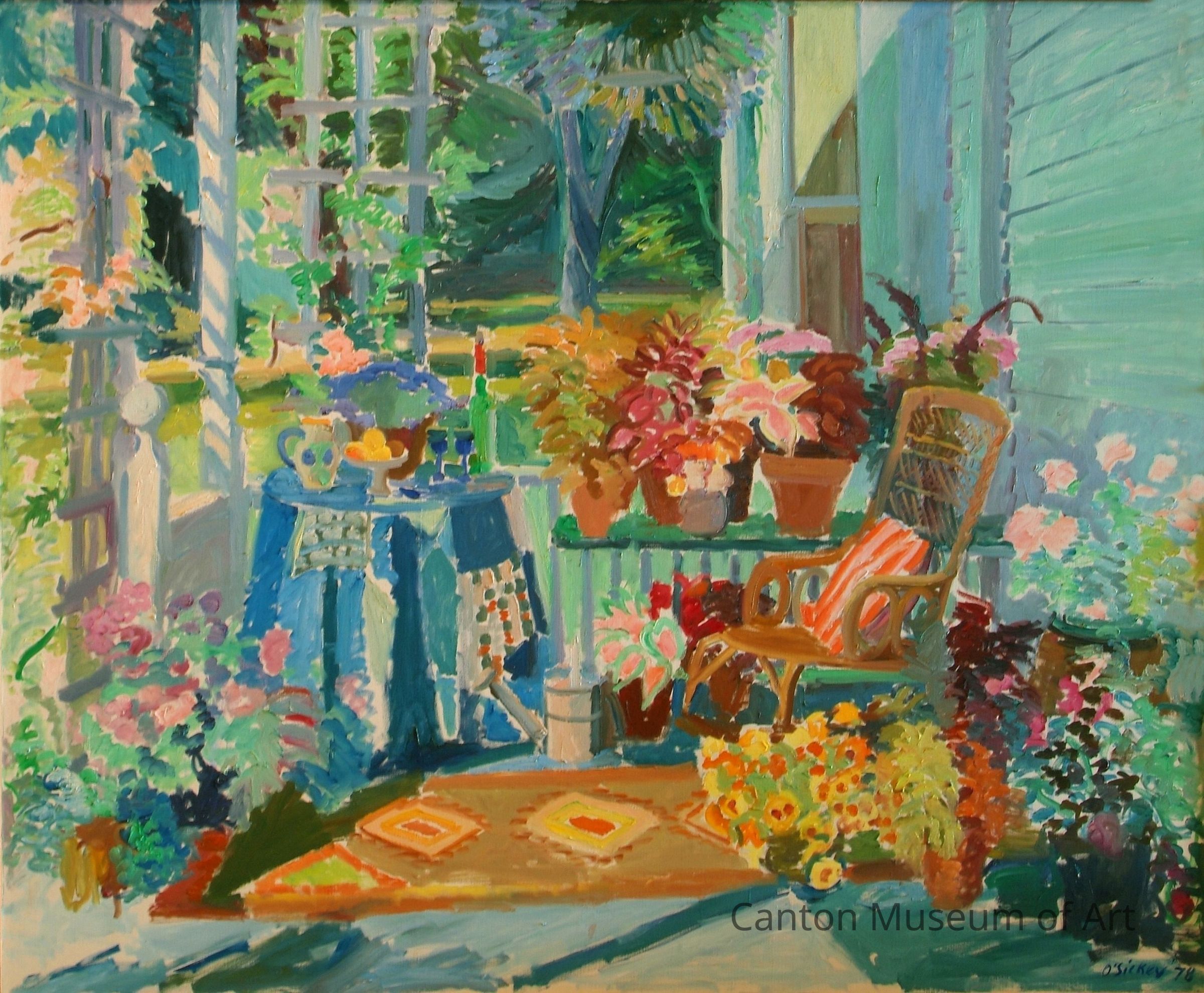 O’Sickey and his wife Algesa vacationed in the summers at their second home in Deer Isle, Maine, from 1962 to 1992. O’Sickey painted en plain air (outdoors), stating, "I don’t design it beforehand or worry about atmosphere." Instead, O’Sickey let the garden be his guide, sometimes even placing his large canvases against his house while he painted. Many of O’Sickey’s paintings are dedicated to this getaway in Maine.
