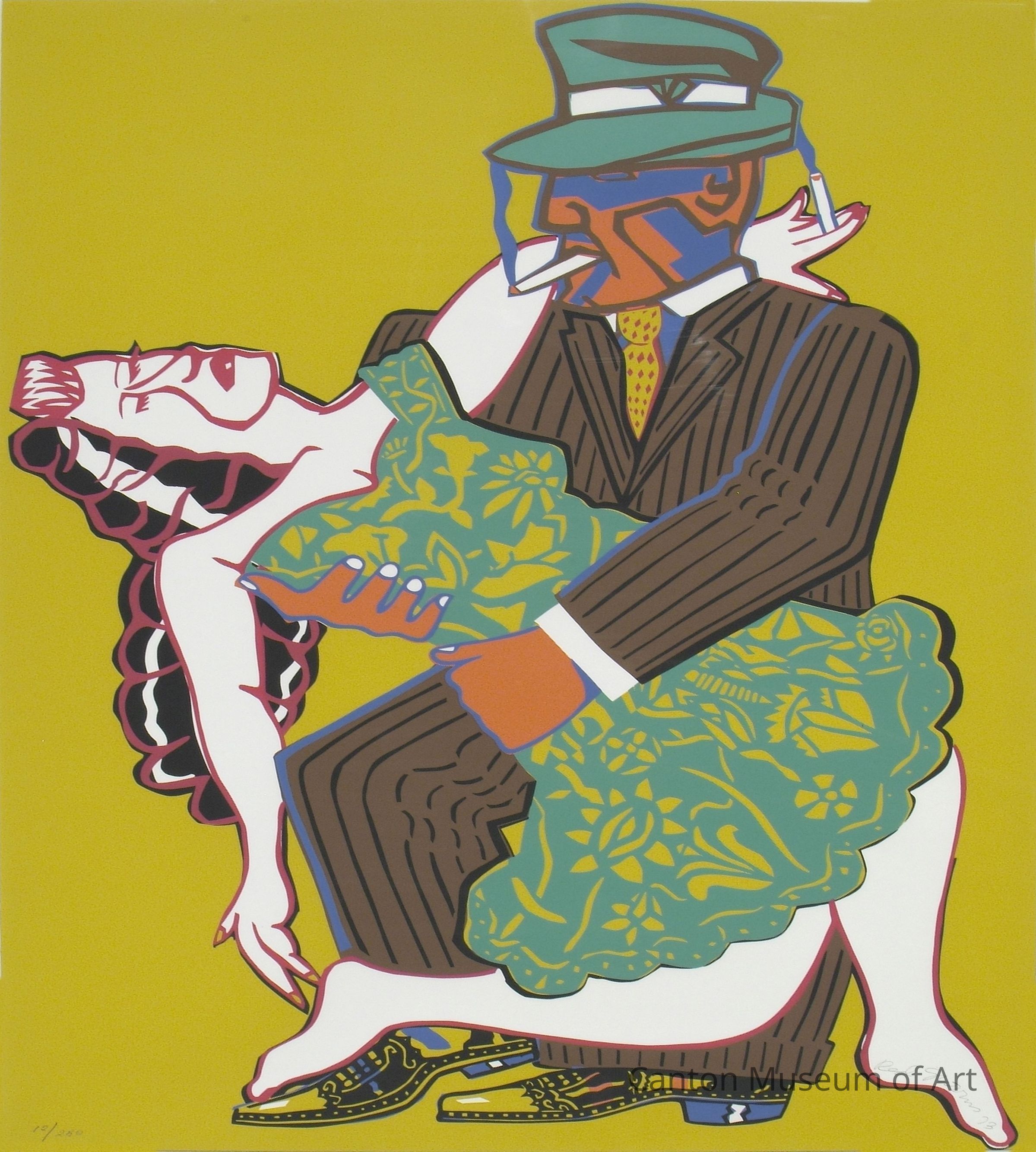 Born in Tennessee, Grooms moved to New York in 1956, earning the nickname "Red" for his red hair. It was in New York that Grooms found his muse, walking around the city with a sketchbook and depicting urban life. He experience the corrupt side of New York, stating "I lived for ten years, from 1965 to 1975, at the corner of Grand and Mulberry. The northwest corner, where there's an Italian deli. Saw a lot of action there. Once some mobster got shot right in front of our door. The police outlined the body in chalk. My daughter was five. She never forgot it." Grooms depicted the gangsters of New York in various works such as this one. "Moll" is a slang term for the female companions of mafia members, and other professional criminals. "It's pretty much the city that makes the language," Grooms explained. "That's what I deal with: the clichés."