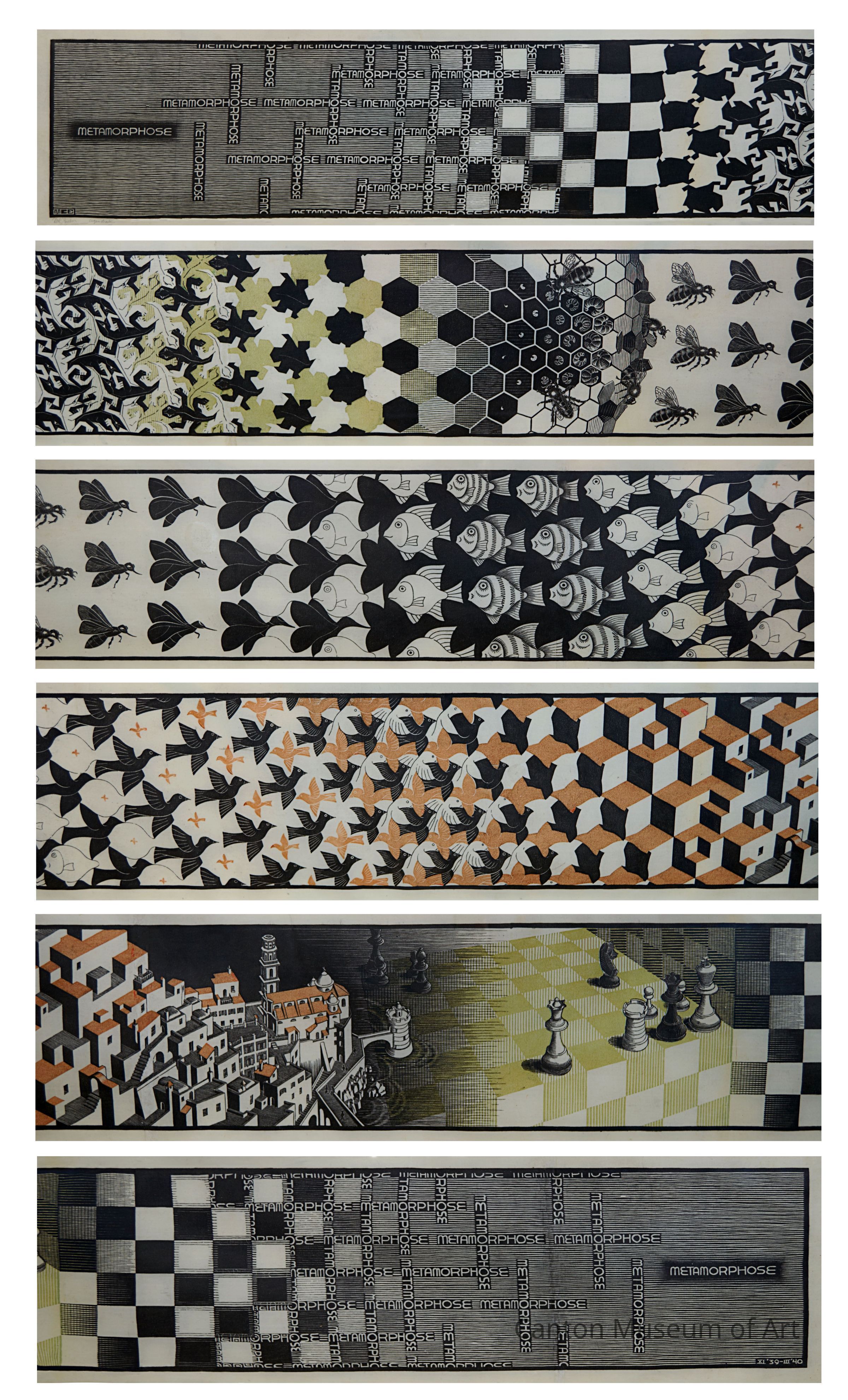 patterning of interlocking forms. Replacing the abstract patterns of the tiles with recognizable figures, in the late 1930s Escher developed his new vision, used in his Metamorphose prints. The idea of “metamorphosis”—one shape or object turning into something completely different—became one of Escher's favorite themes.