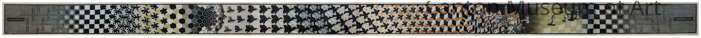 In "Metamorphose II," the process begins left to right with the word metamorphose (the Dutch form of the word metamorphosis). This grid then becomes a black and white checkered pattern, which then becomes tessellations of reptiles, a honeycomb, insects, fish, birds, and a pattern of three-dimensional blocks and red tops. These blocks then become the architecture of Atrani, linked by a bridge to a tower in the water, which is actually a rook piece from a chess set. There are other chess pieces in the water and the water becomes a chess board. The chess board leads to a