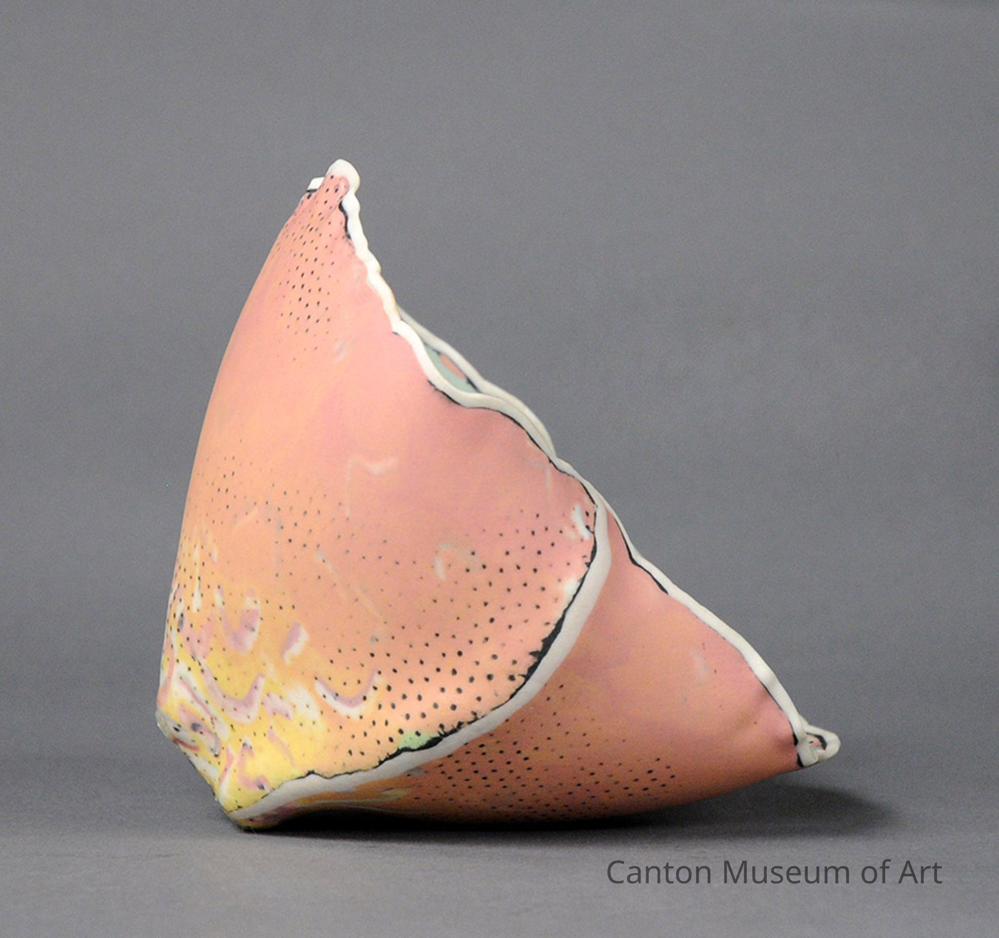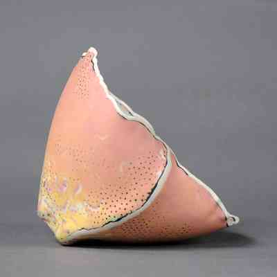 "Misbehavin" is a hand-built porcelain vessel made with translucency. Curtis and Suzan's initial exposure to lithophanes and translucency occurred when they were undergraduate students at Ohio State University in 1970. Professor Margaret Fetzer maintained the OSU Ceramic Department library and, learning of their interest in porcelain, Fetzer ignited their interest in translucency by revealing some lithophane treasures hidden away on a back shelf.