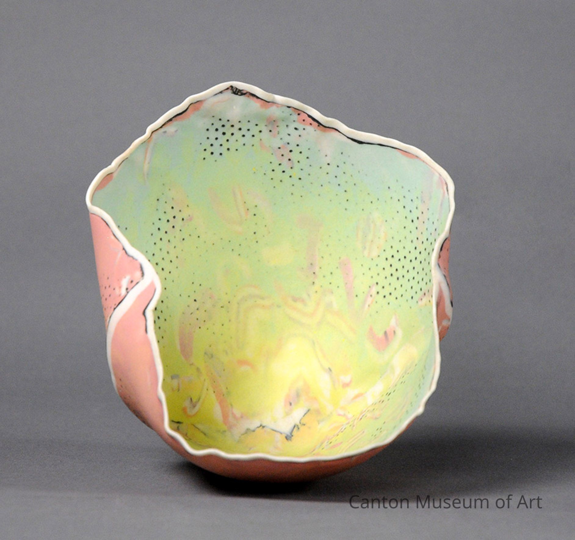 Suzan’s expertise is in drawing, painting, and fibers, while Curtis focused on porcelain. Their collaboration lasted from 1979 to 1992. Curtis created the form, and Suzan influenced the color and design. Translucency is an important part of “Misbehavin." There is a spiritual quality, yet a fun, feminine and tonal quality to the work. There are additional qualities, colors, and sometimes hidden designs that can only be seen when the piece is lit.
