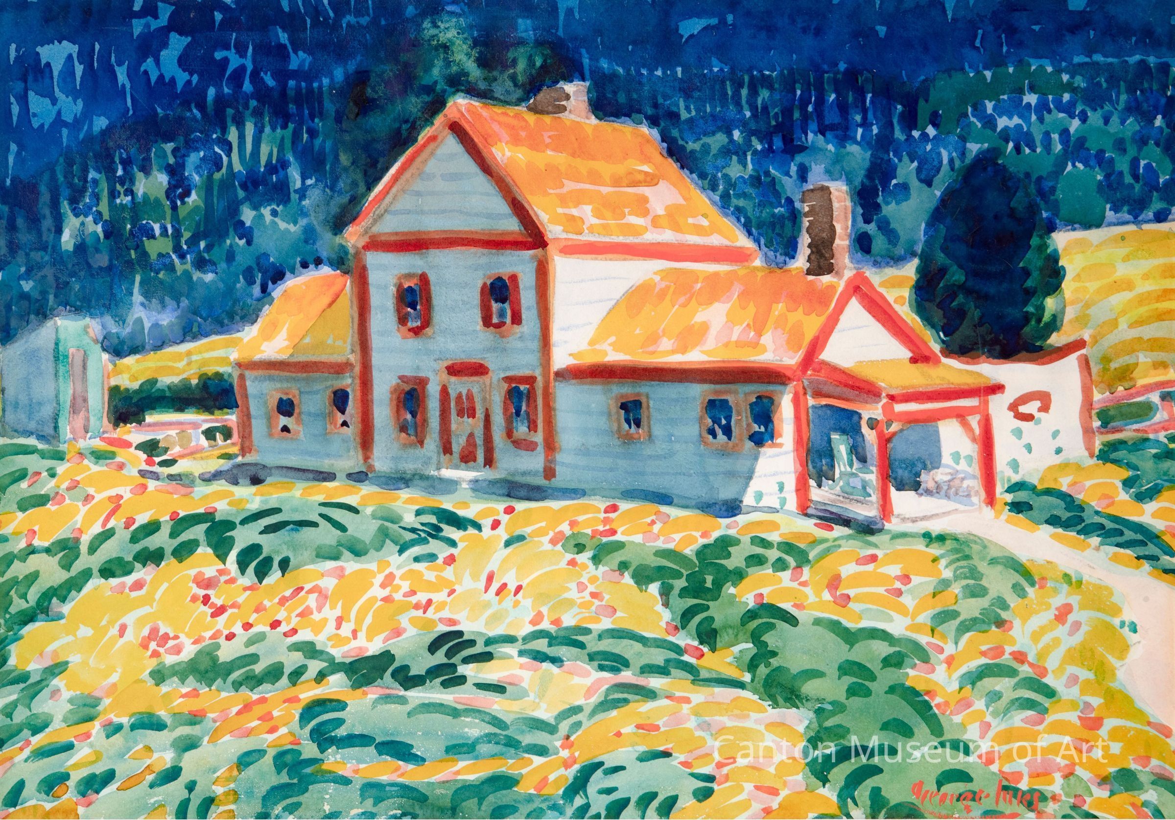 While in Berkshire Hills, Luks came to know and paint the residents while he searched for antiques with which to furnish his home and subjects with which to inspire his brush. The watercolors of this period are among the best he ever produced. His mastery of color is fully evoked, employing brilliant, bold colors. Luks was adventurous with his use of color, with the farm house alternating in orange. red, and white, set amongst the rich green and yellow of the grass. In his work, he strove for originality and opposed traditional painting.