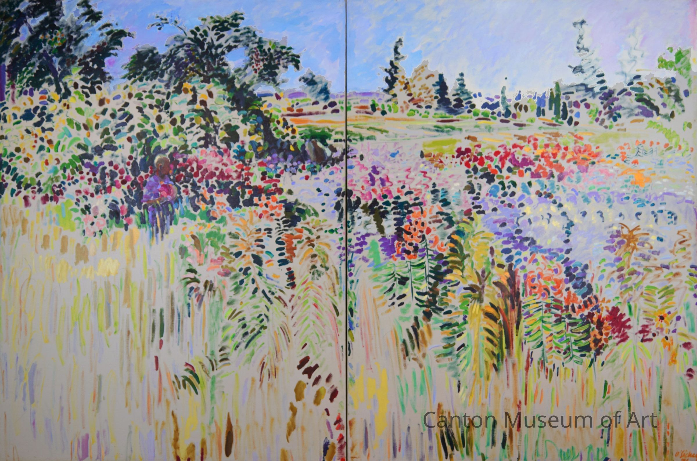 Many artists painted outdoors en plein air, such as Joseph O’Sickey, who painted "Old Man’s Garden" at a larger-than-life size of 8 feet by 11 ½ feet, outdoors, stating “I don’t design it beforehand or worry about atmosphere.” Instead, O’Sickey let the garden be his guide, sometimes even placing his large canvases against his house while he painted.