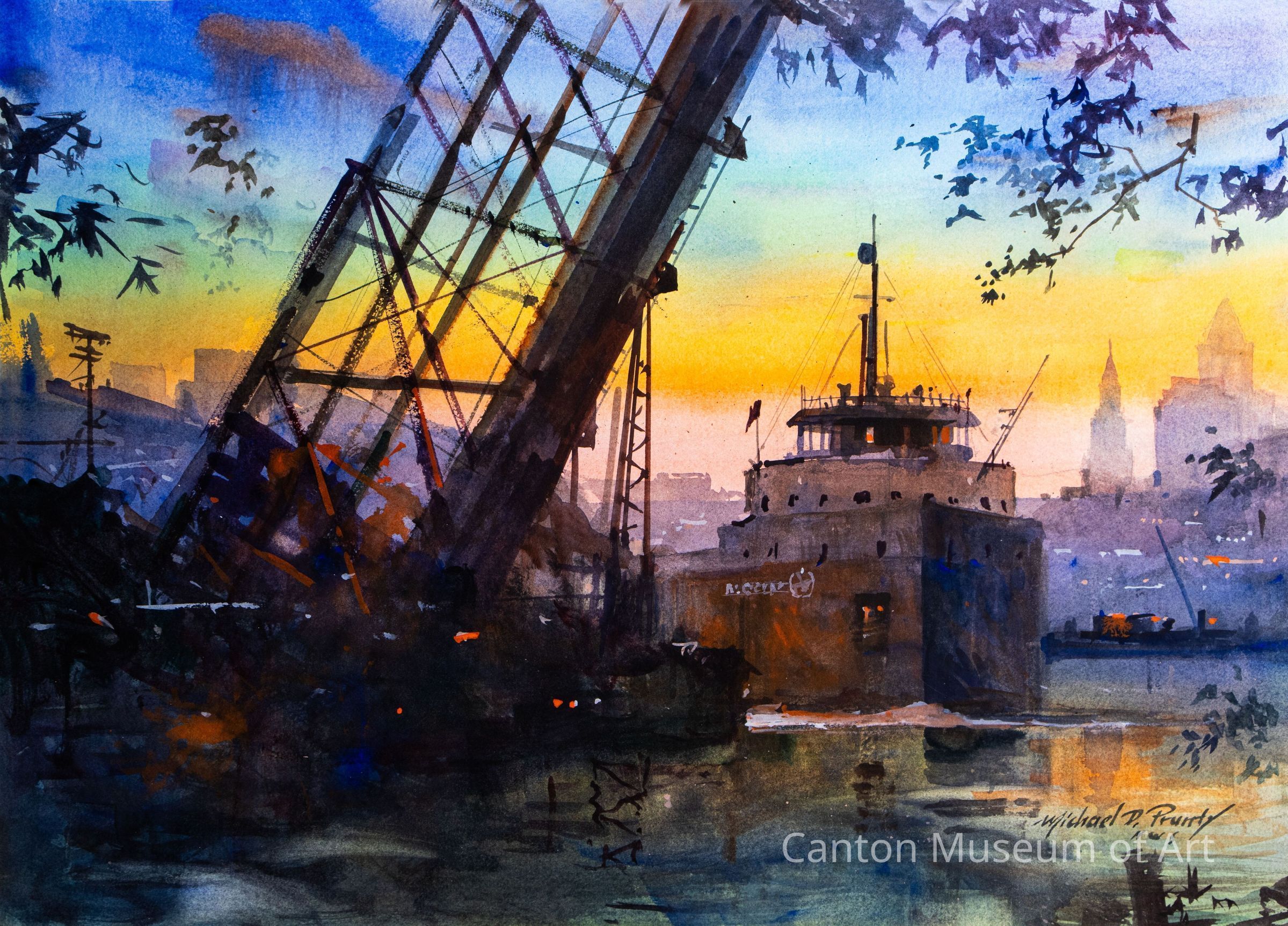 Prunty's signature work became the Flats and the Cuyahoga River of Cleveland, incorporating both nature and the industrial city. With loose and painterly brushstrokes, he described his work as "Casual Realism." Prunty worked exclusively in transparent watercolor, which allows light to pass through the pigment and reflect off of the white paper beneath it. He used this to his advantage, portraying hazy, atmospheric effects in the city settings of Cleveland. This, combined with his loose brushwork, emphasize the emotional aspect of the scene. The magical qualities of light and atmospheric effects are readily apparent in "Ore Boat on the Cuyahoga."