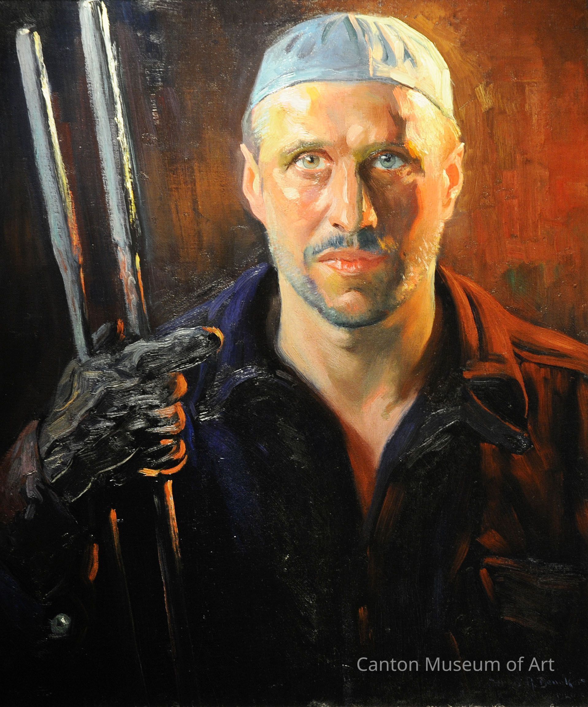 For this painting of industrial worker Homer White,, Beneker describes his artwork in this statement: “He heats slabs in ovens in the rolling mill and wears a stubble beard to protect his face from the intense heat of the furnaces. He looks like a ‘radical’, but look into his sincere eyes and you will find that he is a ‘constructive radical,’ the kind that makes him a leader of men because he has won their confidence and respect. These were the same constructive radicals who during an industrial downturn following WWI, came to their management and said “Boss, you go out and get the work, and we will roll it for you at any price you can pay and make a profit.’”