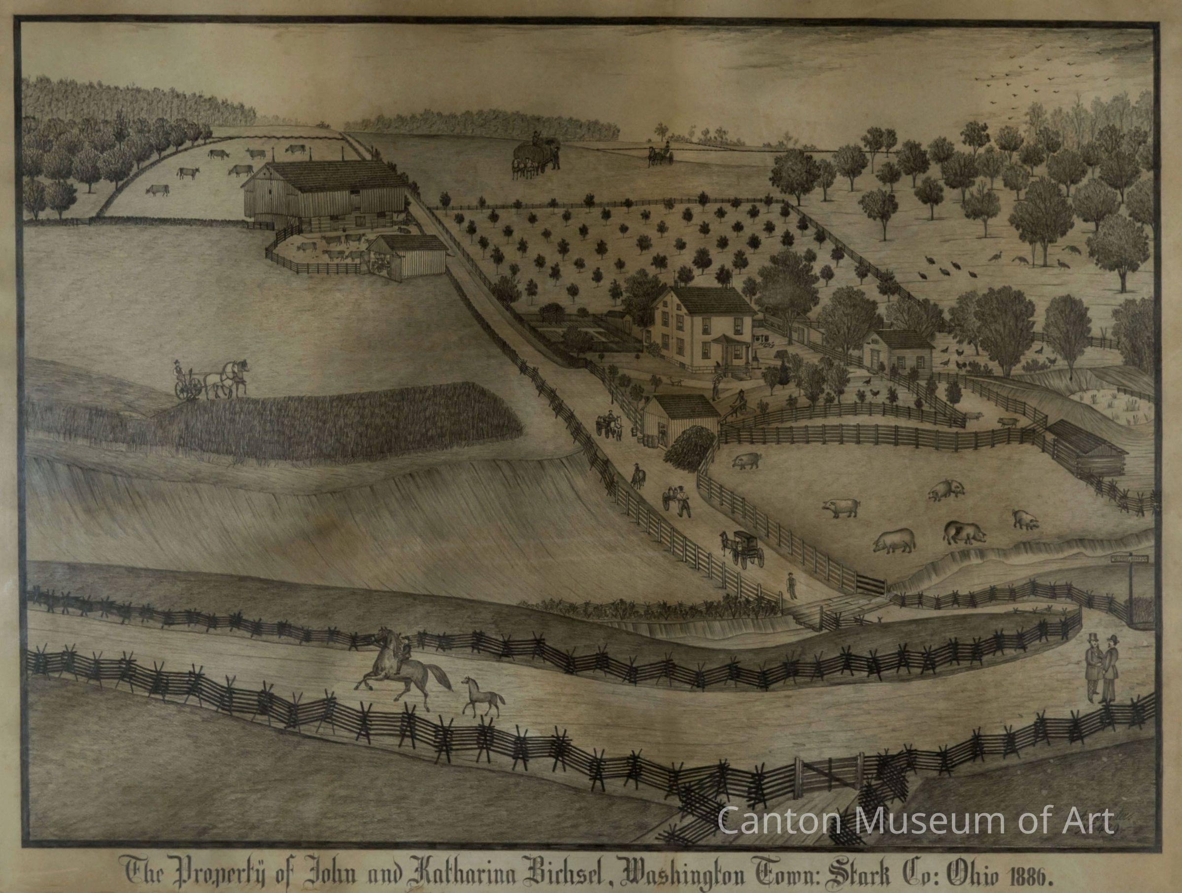 Artist Ferdinand Brader wandered Pennsylvania and Ohio charging farmers a few dollars for pencil drawings of their properties which he created en plein air. He advertised his services by displaying examples of his work at stores in nearby towns. In the winter, when he couldn’t sketch plein air, he moved into public infirmaries. As a traveling artist from Switzerland, he didn’t have a permanent residence in the U.S., or very much money, so he would also exchange drawings for room and board.