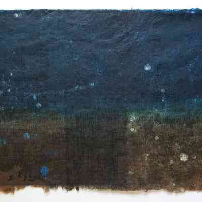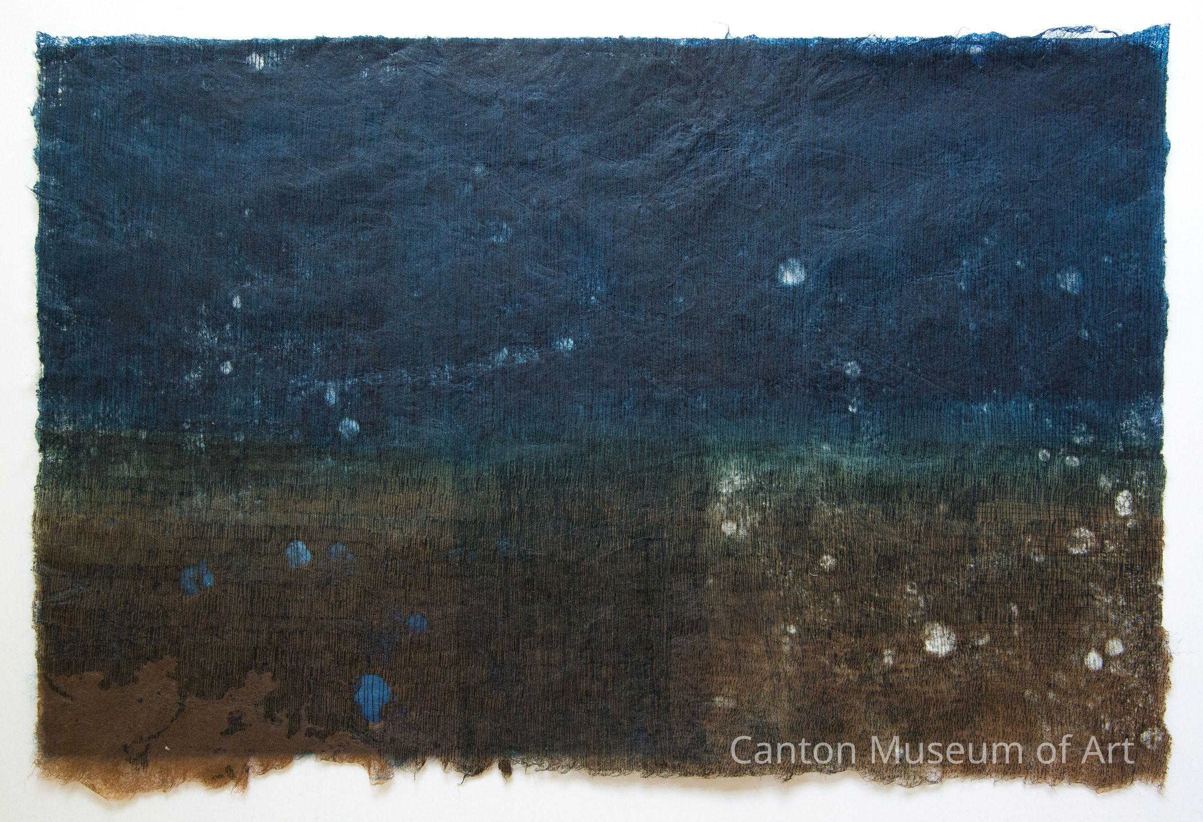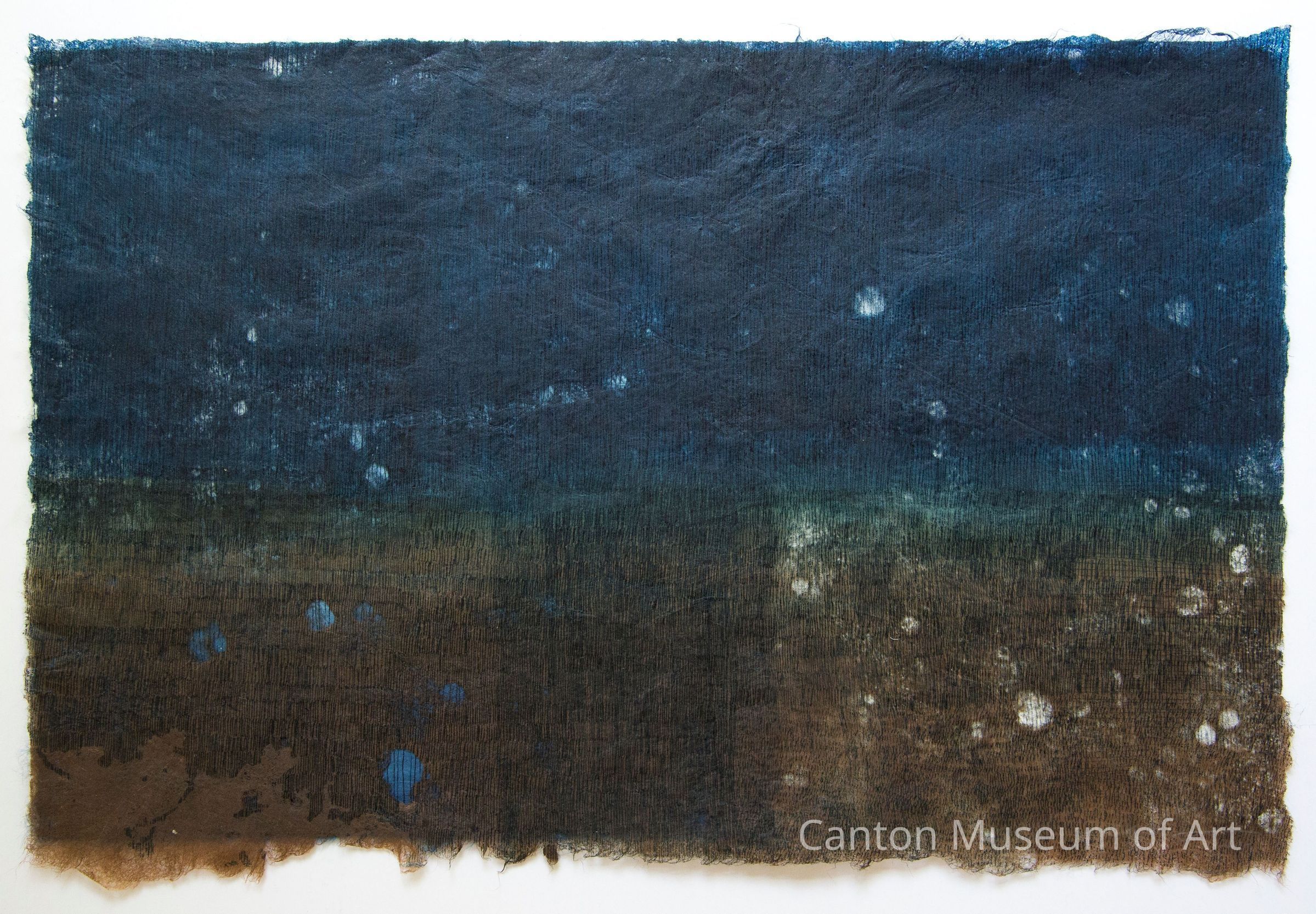 This piece suggests land and sky and was made with etching and monotype on mulberry paper handmade by Yuko. She then created rain drop texture by spraying or dropping water onto the wet kozo fiber. The vertical hatching with line etching that covers the entirety of the piece shows Yuko’s strong interest in mark making and suggests falling rain.