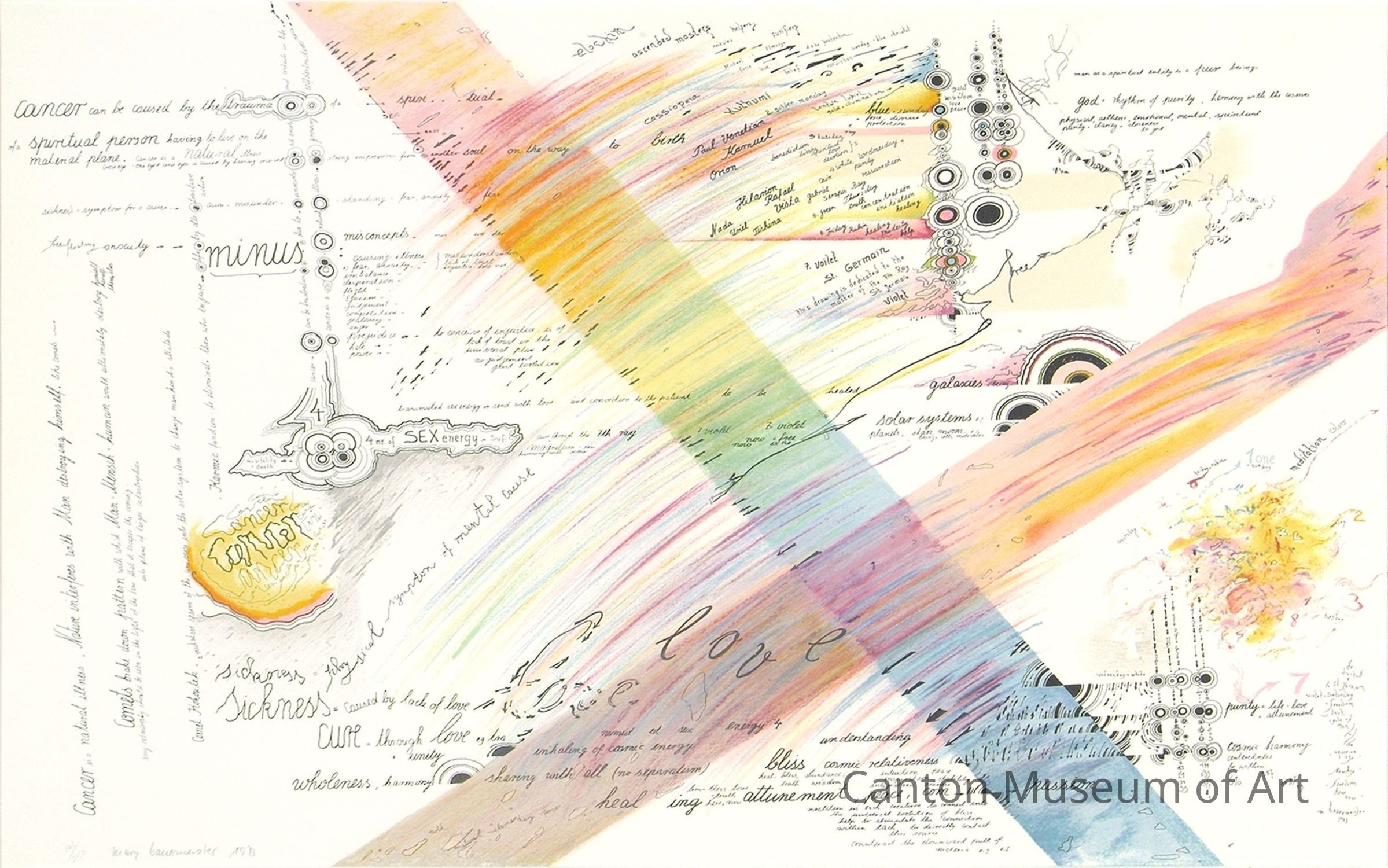 In the 1970s, Bauermeister began to study fringe sciences, including various geomancies, or forms of divination. It was during this period that she made "Rainbow," a work that serves as a mind map interweaving ideas and experiences from the artist's life. With words such as sickness, cancer, love, and healing depicted, thoughts flow from negative to positive, invoking hope for brighter things.