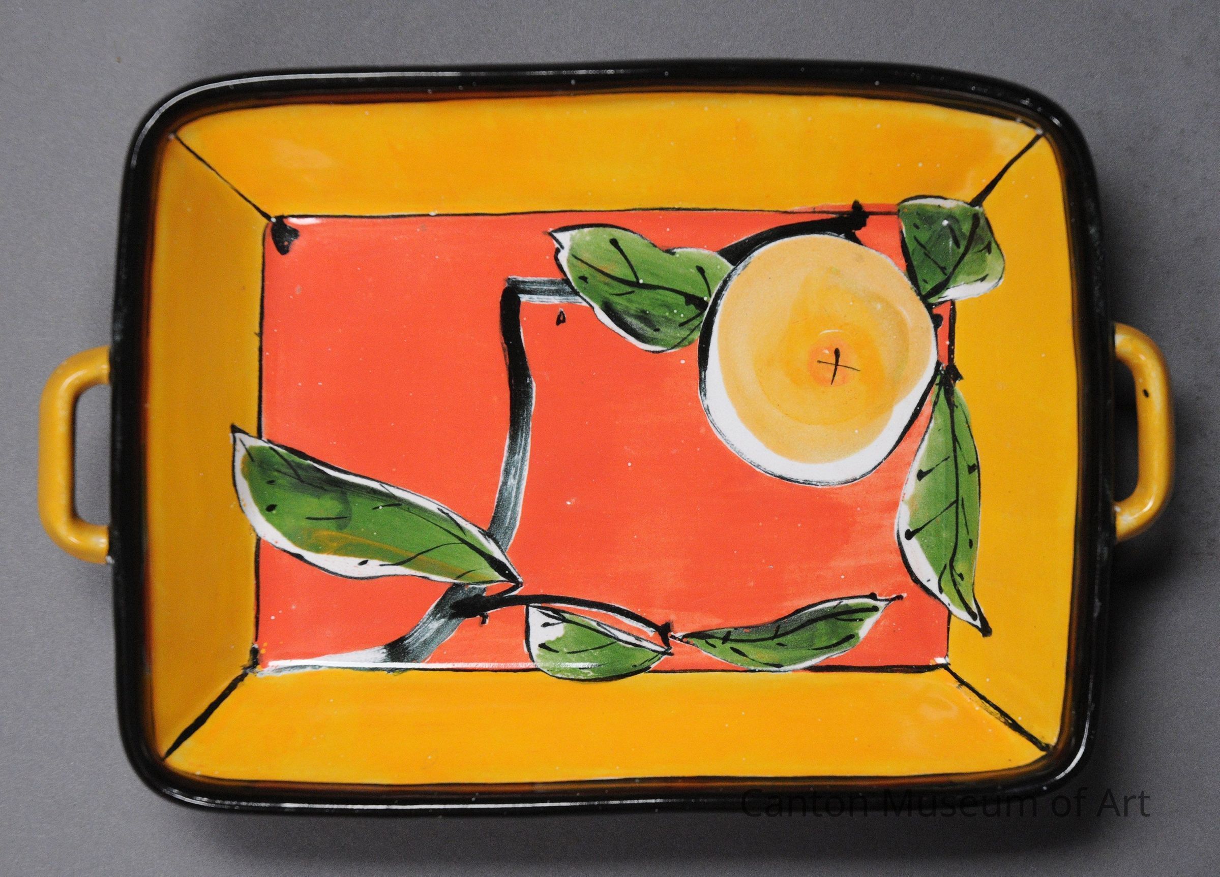 Arbuckle uses the process of majolica to create her bright, bold pieces. Majolica is a decorative ceramic technique of painting with glaze materials on top of an opaque, tin-based white glaze. It is a process that was first developed in the Middle East to imitate Chinese Porcelain. Unlike other glazes, majolica is viscous and does not move when fired.