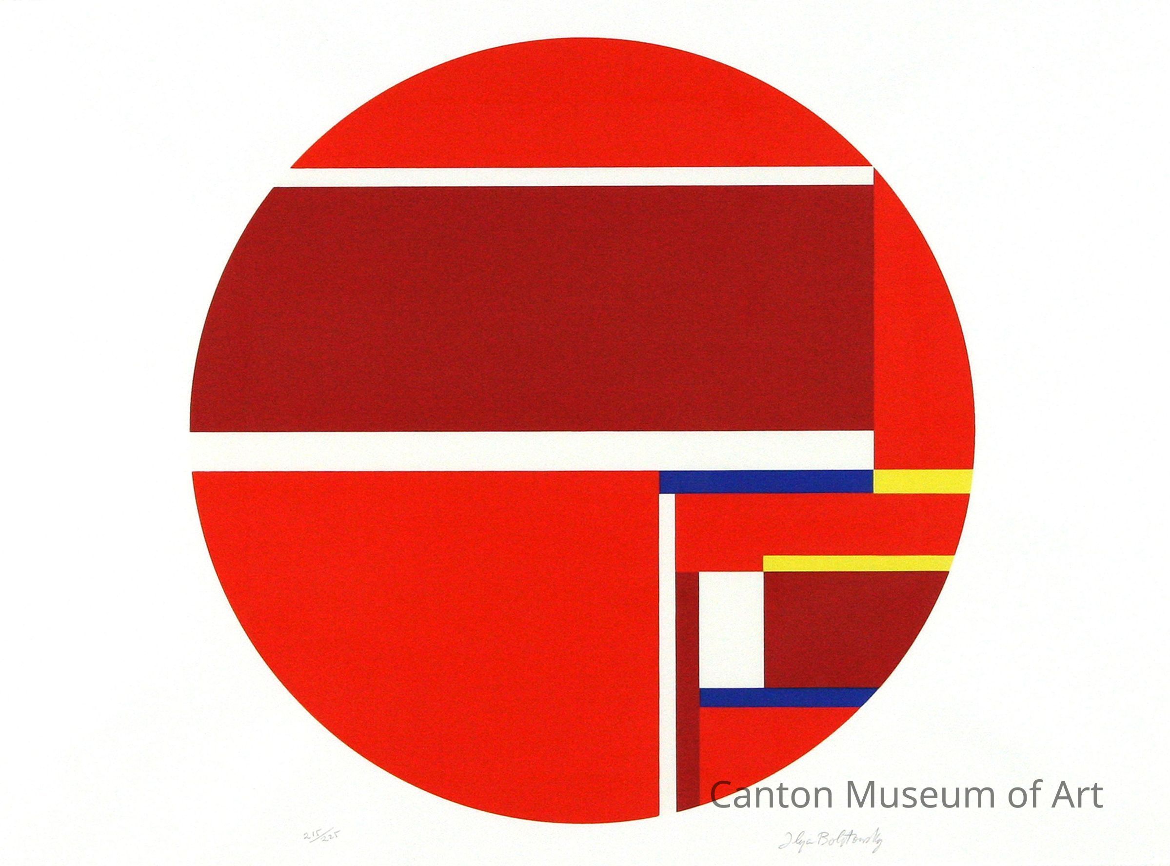 At the University of Wyoming, where Bolotowsky taught after serving in the Army Air Corps during World War II, Bolotowsky met a farmer who gave him several wagon wheels. He stretched canvas over the wheels’ rims and called these round paintings tondos, in reference to the circular paintings of Raphael. For the next twenty years, Bolotowsky experimented with the optical effects posed by this round format. Round compositions are notoriously hard to master, because the eye is led around in ways that does not anchor it to a focal point as easily as compositions on rectangular formats.