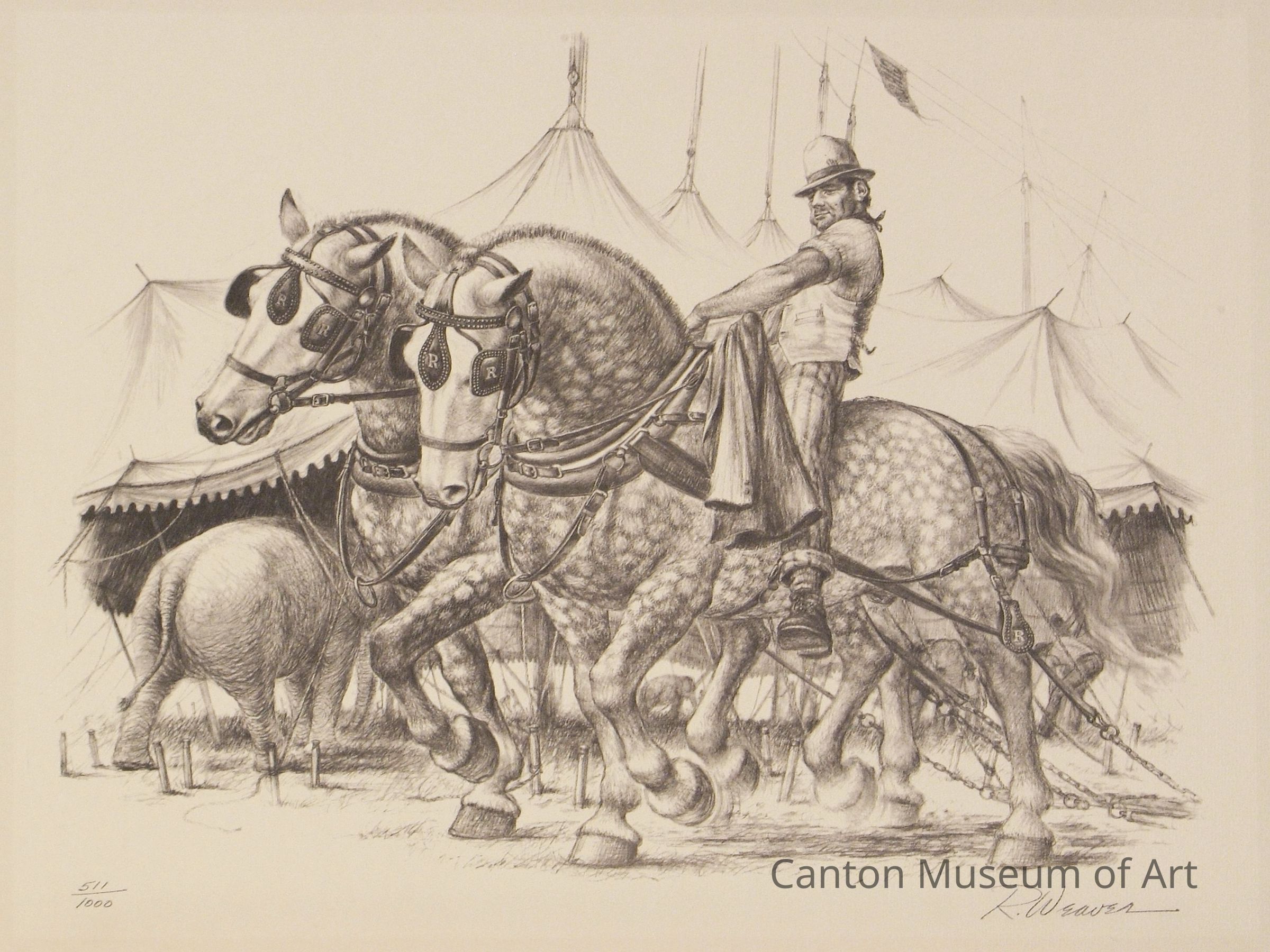 "Ringling Brothers - Barnum and Bailey, Utility Team" is a depiction of a circus lot around 1930. Weaver traveled with Ringling for a summer in the 1930s, doing odd jobs and sketching incessantly. Horses were some of his favorite subjects from the circus; he loved their power and grace. A utility team of horses, always of the draft breed, would be used to move tent poles, assist other teams in pulling wagons, and hoist the huge canvas tents to their full height. They were the work horses of the traveling circus of that era. Weaver considered this one of his best portrayals of on-lot activity.