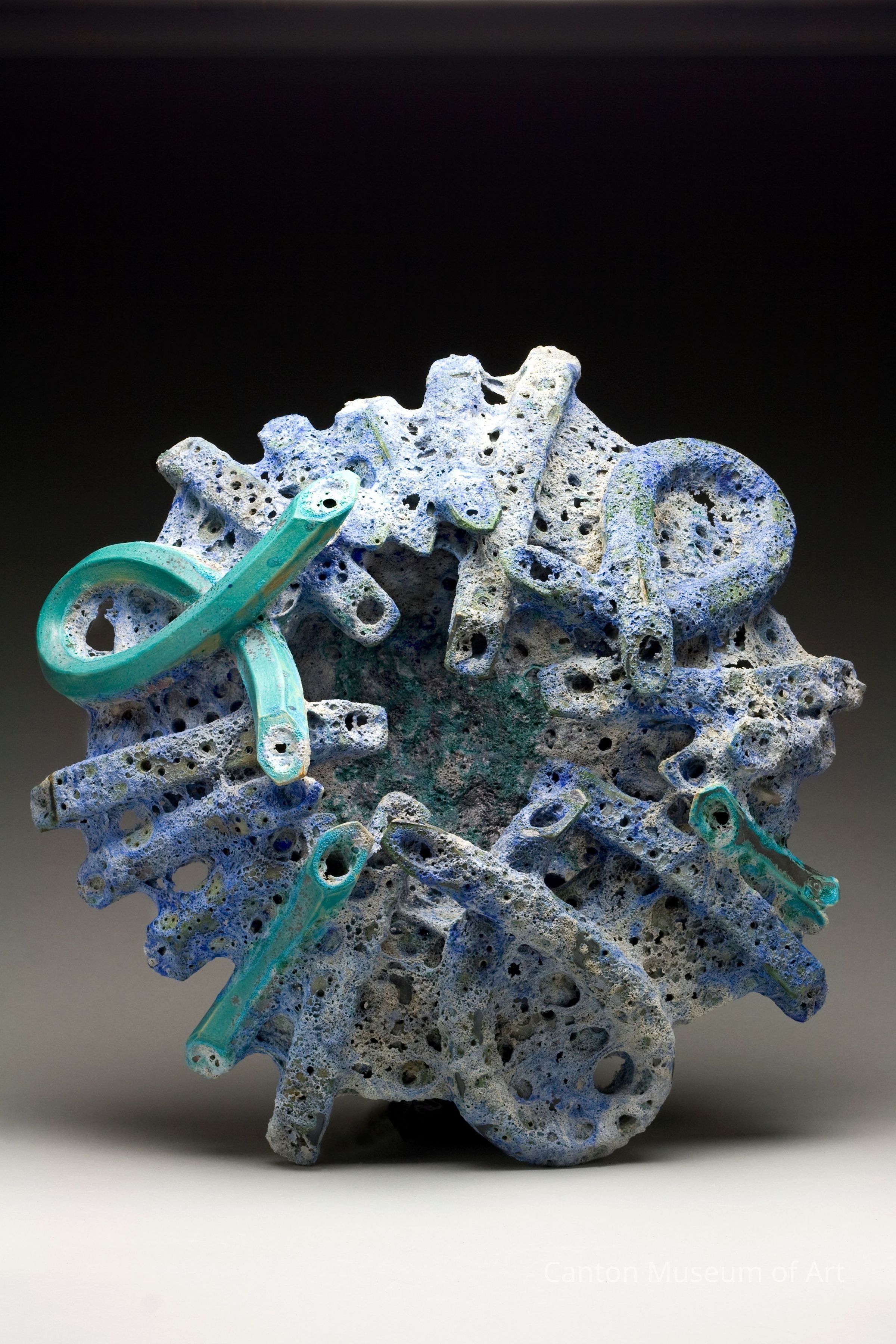 "Rollin" was created at a residency at the Red Lodge Clay Center in Red Lodge, Montana. It was made on the potter’s wheel for the first stage and then hand-built. The piece was then brought back to Cleveland to be glazed by a unique process that Todd invented, which involves ceramic stain, Todd’s special foaming glaze that off gasses and bubbles while being fired, and two regular colored glazes. After firing, the piece was sandblasted with a dry crater glaze to give the appearance of erosion over time. Todd is seeking to push the limits of ceramic materials; to innovate, experiment, and explore all of the possibilities that clay has to give.