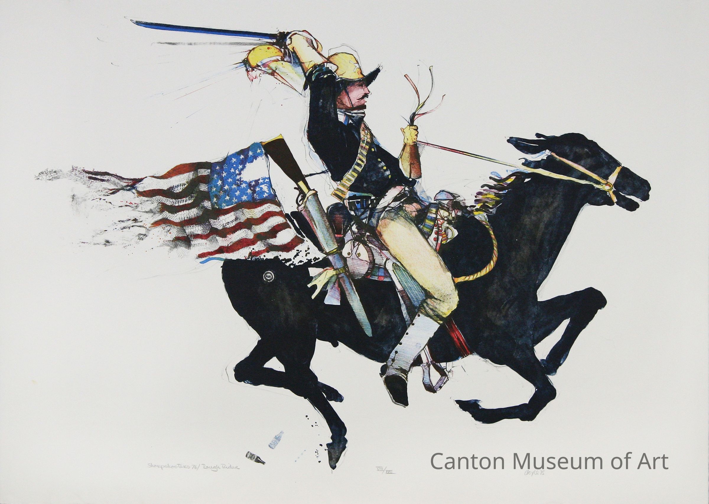 John Lawrence Doyle was known for his lithographs reflecting his fascination with the human condition. For over a decade, Doyle studied ethnology and anthropology. Directly after the end of the Vietnam War, and in anticipation of the U.S. Bicentennial in 1976, Doyle created a series of 11 lithographs - "Sharpshooters 76;" which presented soldiers from wars of America’s past in chronological order. “I wanted to do something that people at the time didn’t particularly want to deal with — war. Particularly, coming so close to the end of the Vietnam era. Folks just sort of wanted to forget it. I also wanted to show that the history of this country is a rather bloody affair, a war every twenty years or so. Courageous no doubt, but dehumanizing nonetheless. This dehumanizing process is what I hoped to show through the evolution of the wars, from the somewhat gentlemanly conducted affair of the Revolution to the dehumanized slaughter of Vietnam.”