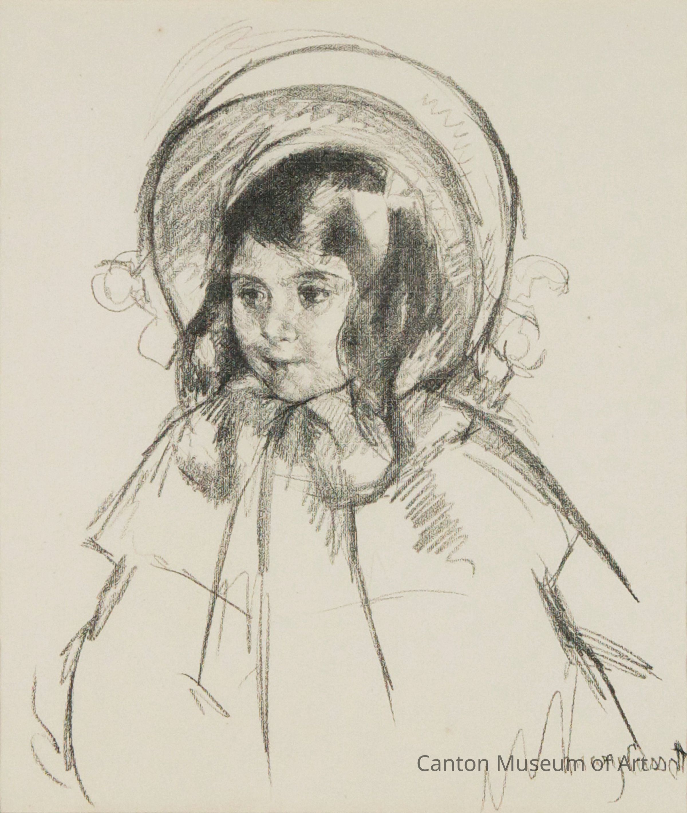 "Sara Wearing Her Bonnet and Coat" is one of Cassatt's rare lithographic works. It is one of only two known prints in lithography executed by Cassatt. The subject, Sara of Mesnil-Theribus (a village outside of Paris), is one of two other girls which Cassatt used in a series of works. Cassatt worked with the same model several times; this technique was an influence of Degas. Sara's relaxed, natural pose is typical of Cassatt's style.