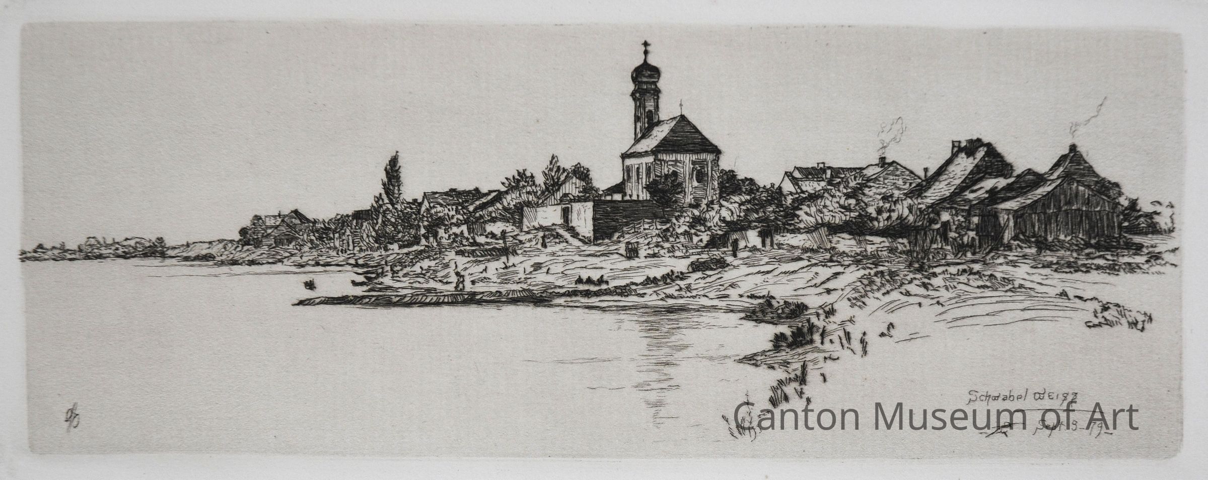 "Schwabelweis" dates from the one-year period Bacher lived and worked in Germany, where the art of etching became his focus. Schwabelweis is a city along the Danube River in Germany, and Bacher’s etching of the location clearly shows his great skill from this period in his career. Published in "American Art Review,” "Schwabelweis" is one of the "Danube Set" of Bacher's German compositions.