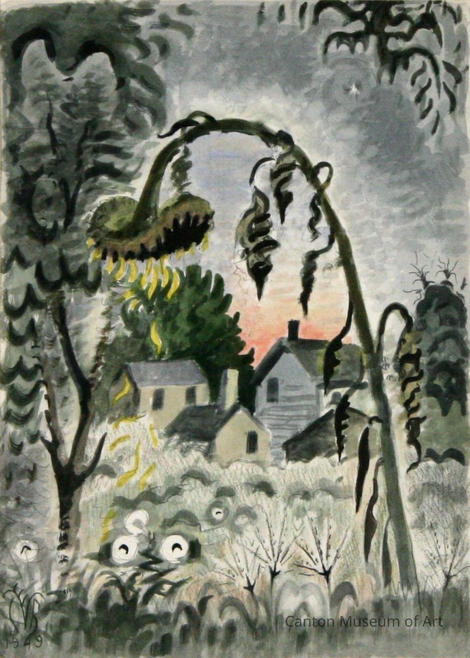 Burchfield’s talent was described in 1917 by one of his teachers: "Mr. Burchfield sees nature with keen penetration. To him nothing is commonplace, everything is radiant, with beauty all its own. His pictures shock the observer into looking at nature from a new angle. Burchfield paints not merely what he sees, but what he feels about what he sees. His pictures reflect states of mind induced by experiences with the outside world. His pictures reflect moods." In "September Afterglow," a wilting sunflower conveys sadness, as does the overall gray tone of the scene and the symbolism of the setting sun.