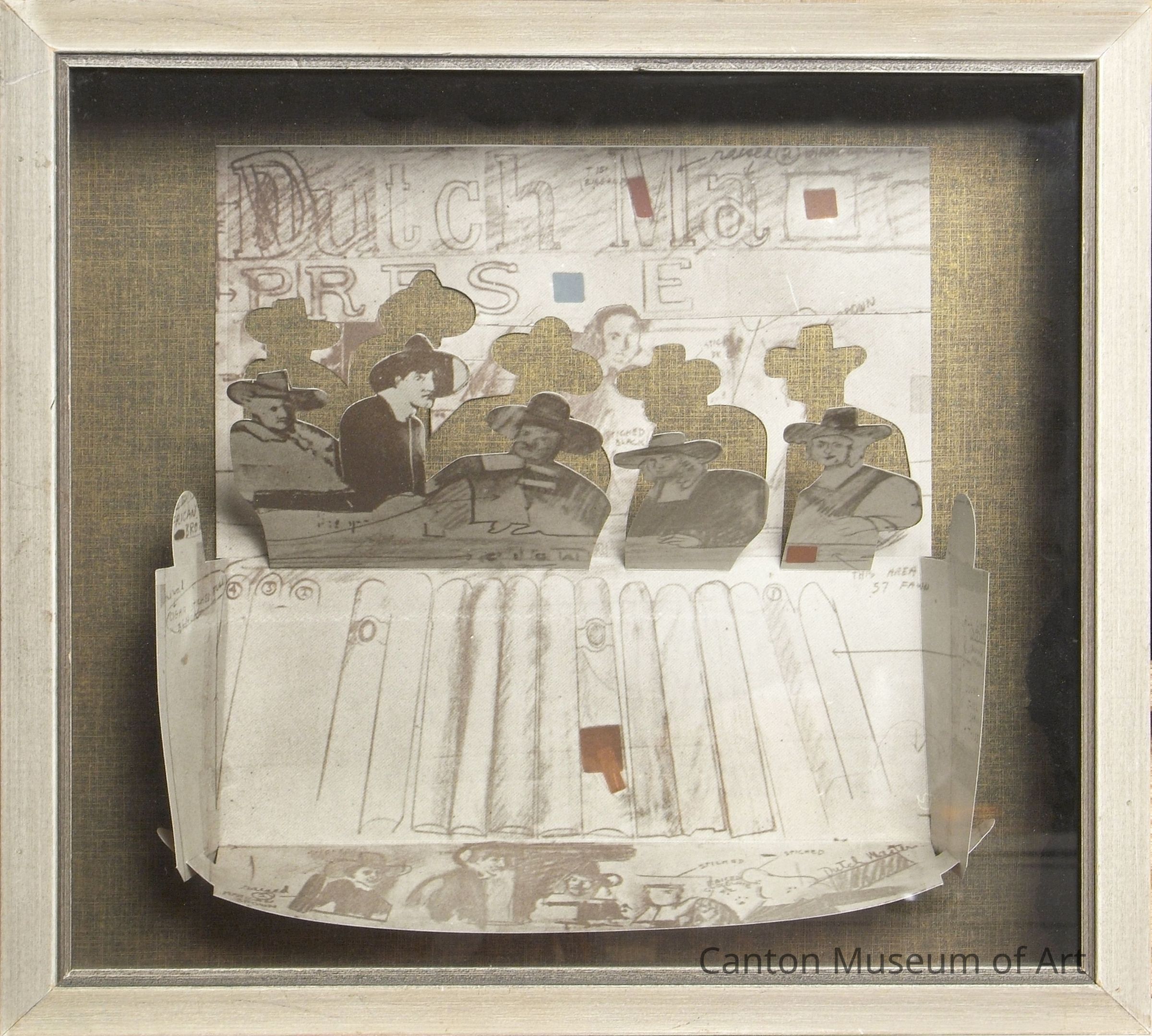 The resulting paintings, lithographs, and sculptures by Rivers are commentaries on consumerism and the relationship between capitalism and cultural objects. This particular silkscreen was created for Multiples Inc., the art publishing company founded in the 1960s. During its existence, Multiples Inc. published work by some of the most important artists of the 20th century, including many Pop artists. This silkscreen by Rivers looks like it folds into the shape of the cigar box that inspired it and features River's version of the Dutch Masters Rembrandt.