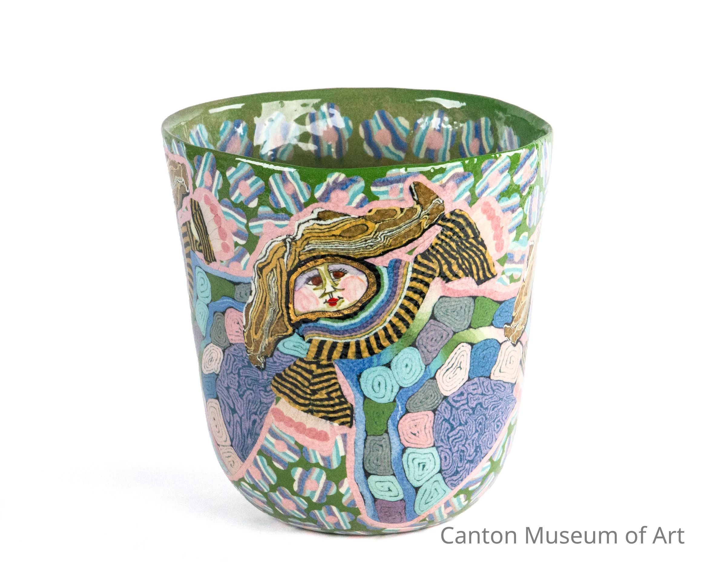Peiser chose to work in relative isolation from other professional craftsmen in Penland, North Carolina, in the respective wilderness. "Finding my own way with clay was easier for me because I was out of touch with other current potters and schools of pottery." - Jane Goslin Peiser Peiser considers her pieces to be utilitarian. Her work is very individualistic, using the millefiore technique. She uses white porcelain clay and colors it with stains and oxides. She makes a sketch first and then proceeds to construct the image in clay, rolling out colored slabs to represent the various parts of the image and then piling them on top of each other. She keeps layering and packing these all together until she has what looks like a big loaf of bread. Peiser slices a piece off with a wire and rolls it larger with a rolling pin. She is now ready to start building a pot inside a plaster mold shape. After the piece is dry, it is sanded and bisque fired, then glazed and fired in a salt kiln. One more low fire firing is done after details are painted on with china paint.