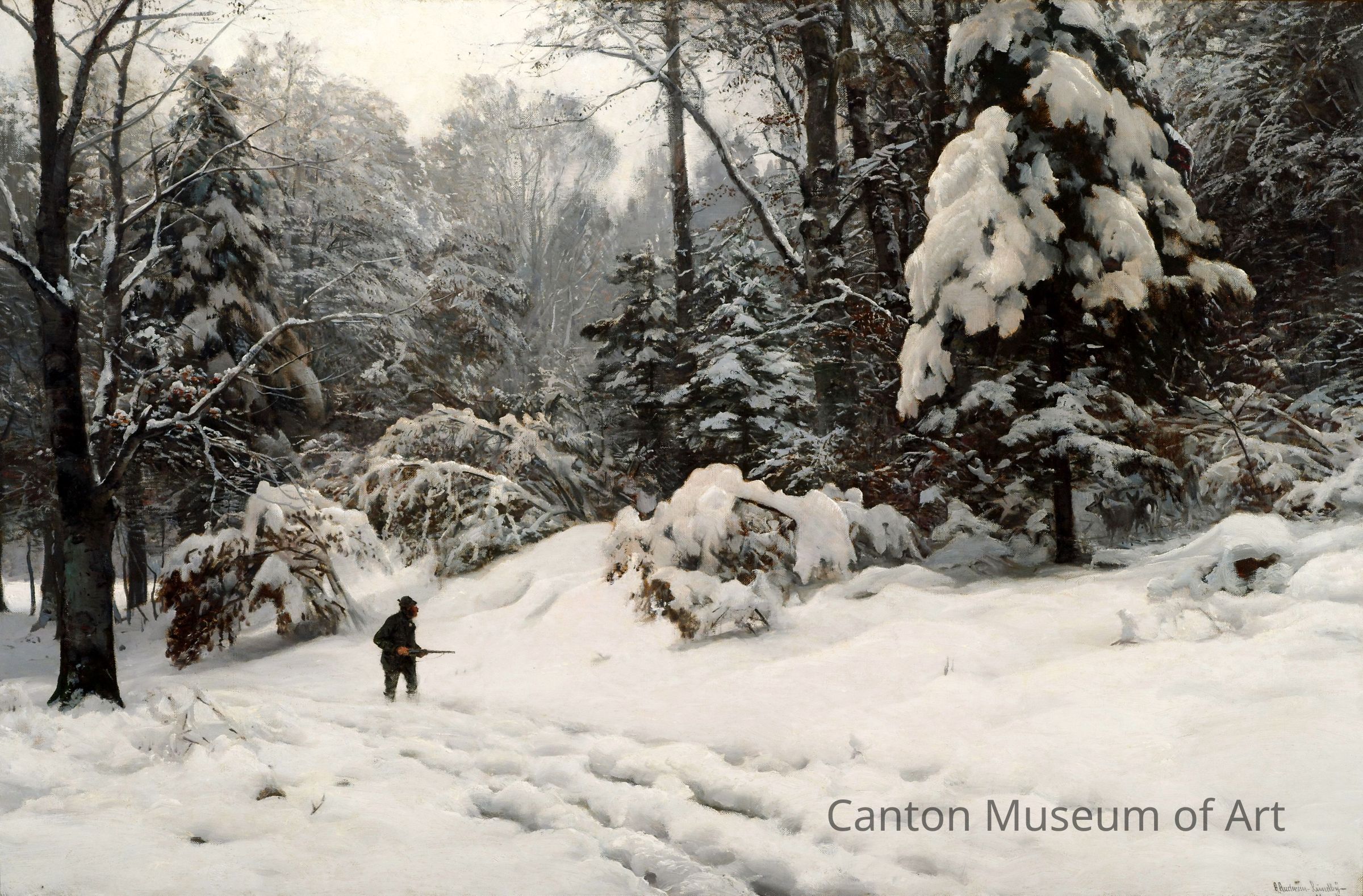 Andersen-Lundby is known primarily as a landscape painter specializing in winter scenes. He especially loved the twilight hours when it was possible to catch the subtle coloration of reflected light. Perhaps no painter of his time or the entire 19th century surpassed him in the realism portrayed in the subtle colors of the setting sun on the snow of his paintings. This painting, which had been darkened by air pollutants, was restored and cleaned in June of 1991 through a grant from the H. W. Hoover Foundation.