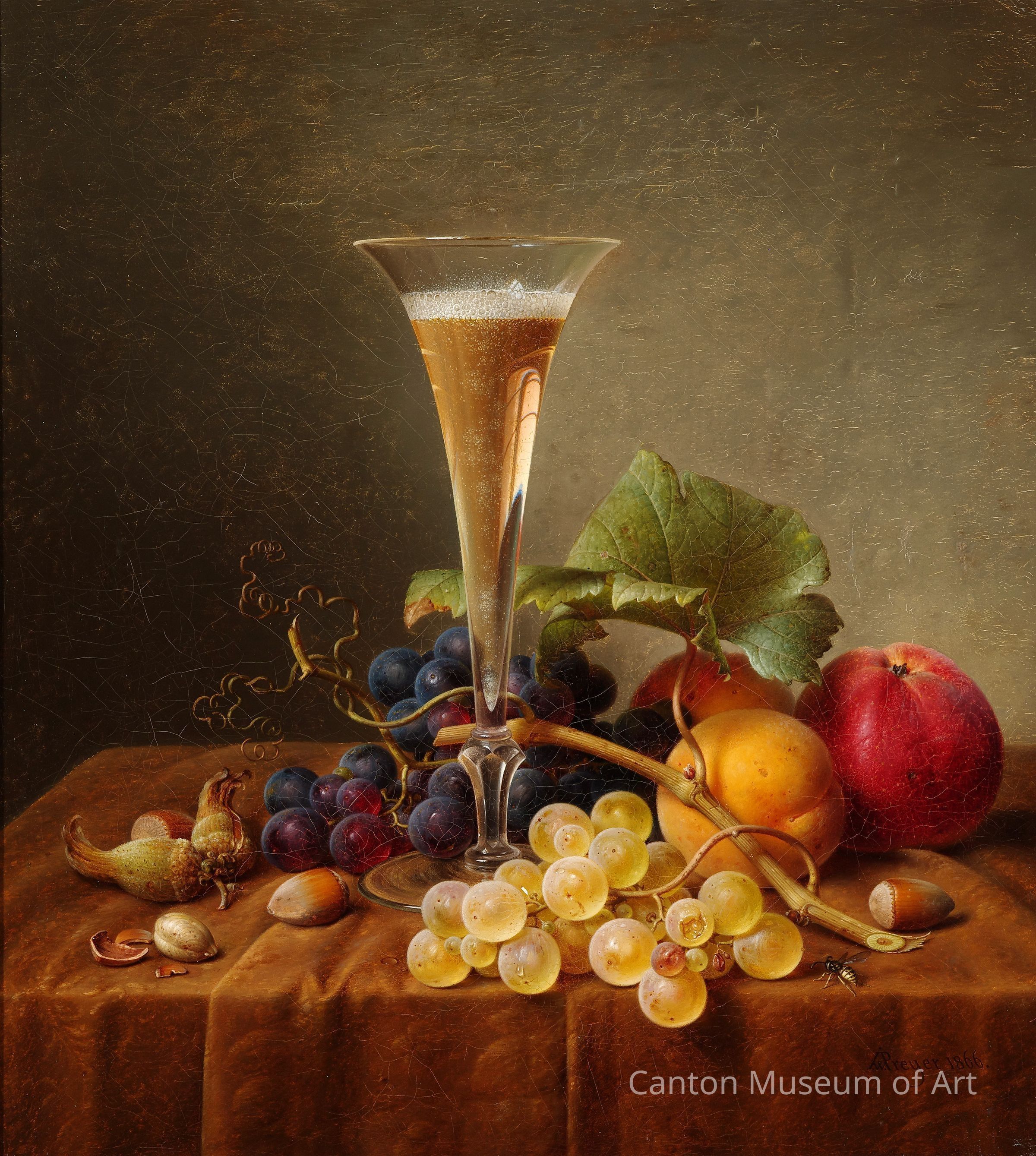 Preyer specialized in extremely detailed still lifes, such as this one, and looked back to Dutch Old Master paintings, even using similar “vanitas” (symbolic) motifs, such as the bee on the table, and the inclusion of bubbles: symbols of life’s fragility. His still lifes were much sought-after and appreciated during his lifetime for their precision and careful detail work.