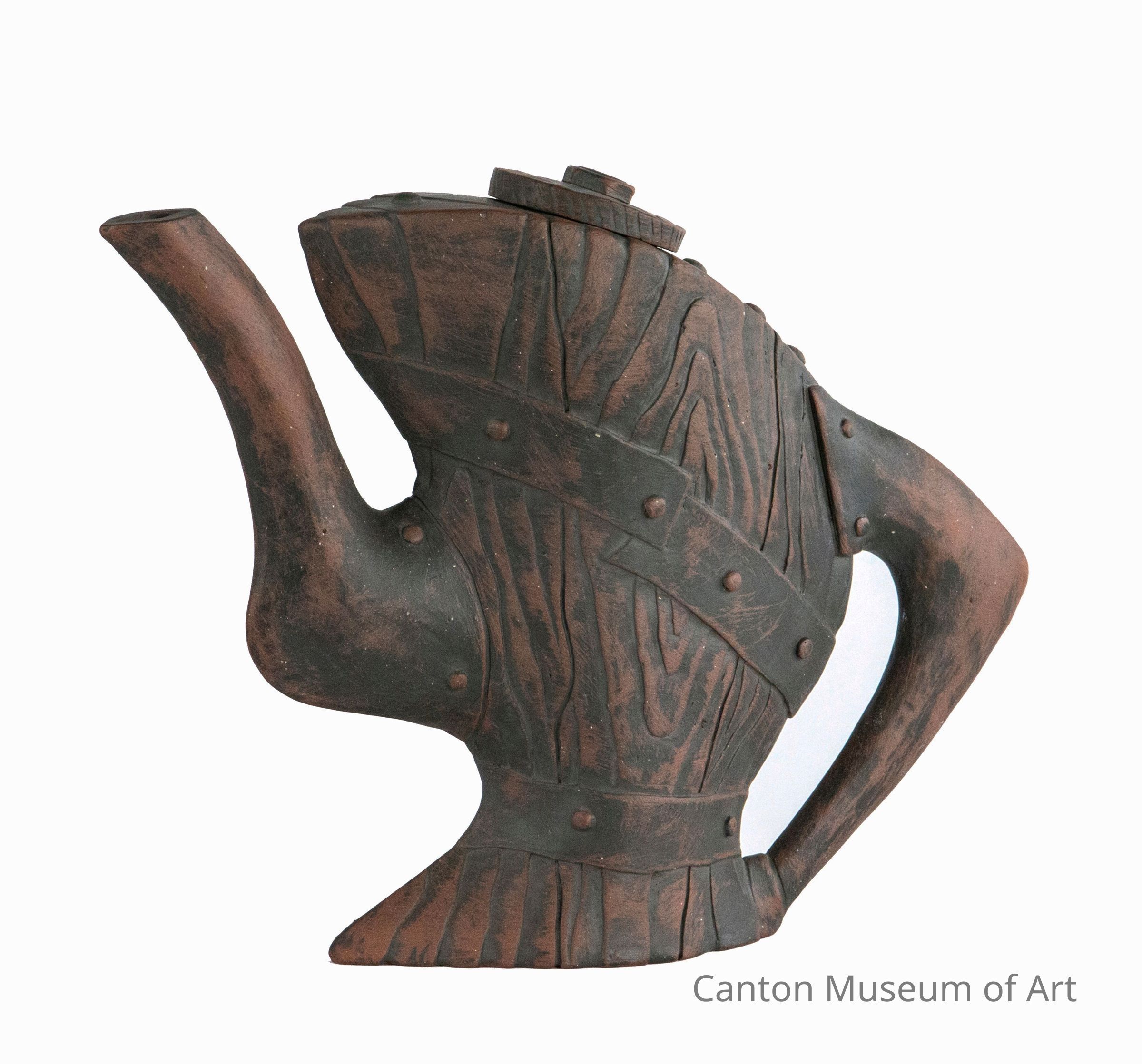 Tisdale said that the “wood” and “strapping” in his clay trompe l’oeil Teapot are references to his southern upbringing, specifically the religious component, the wood being a reference to the earth — ‘from the earth we came and to the earth we shall return’. The strapping is a symbol of being tied to the influences of our past.