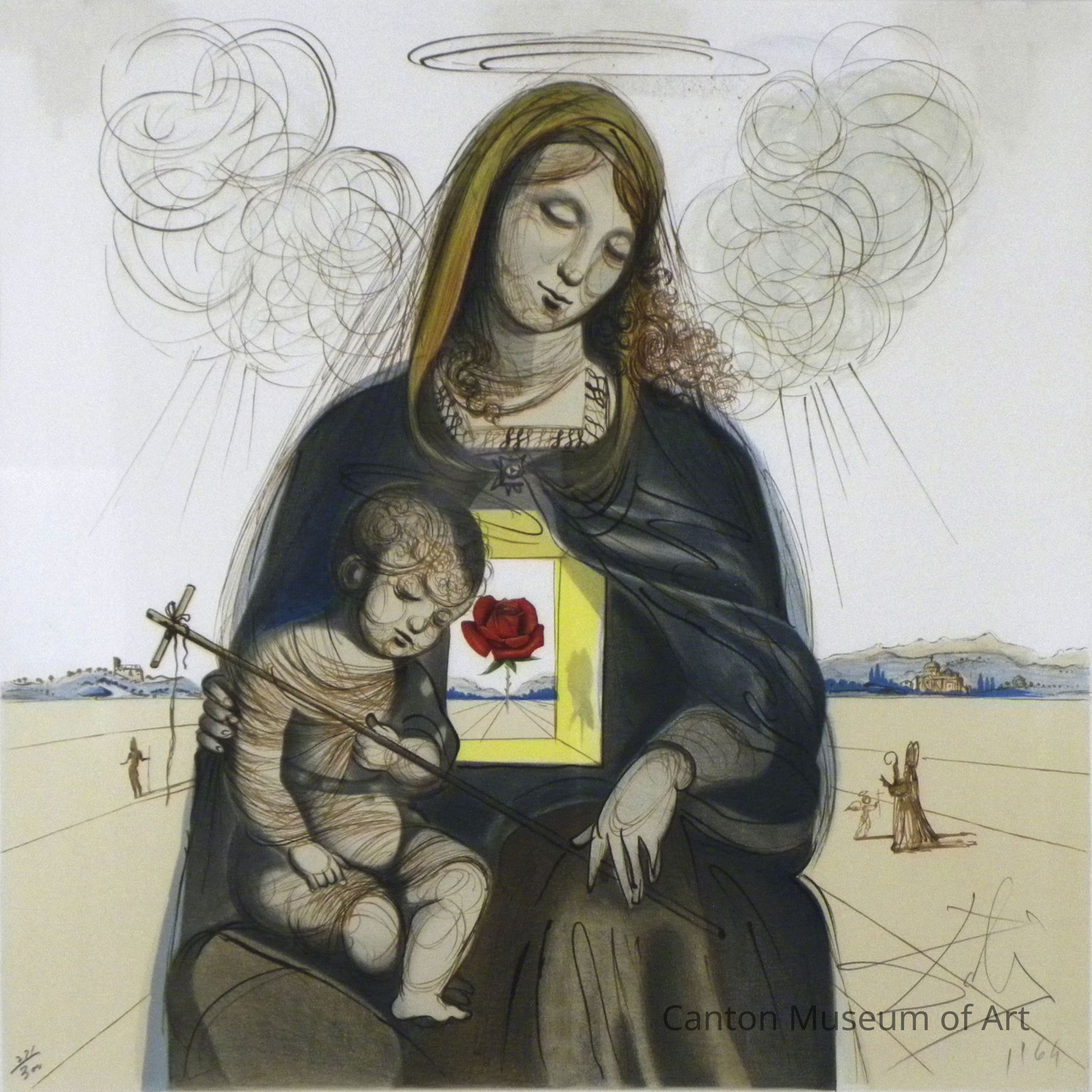 Dalí’s representation of Madonna pays homage to the many images of her painted by Italian Renaissance master Raphael (Raffaello Sanzio). Dalí sets his Madonna with the guardian angel of Florence and a small child adoring her in the background. One of the titles given to her is "The Mystical Rose," an image of mystical rather than physical beauty.