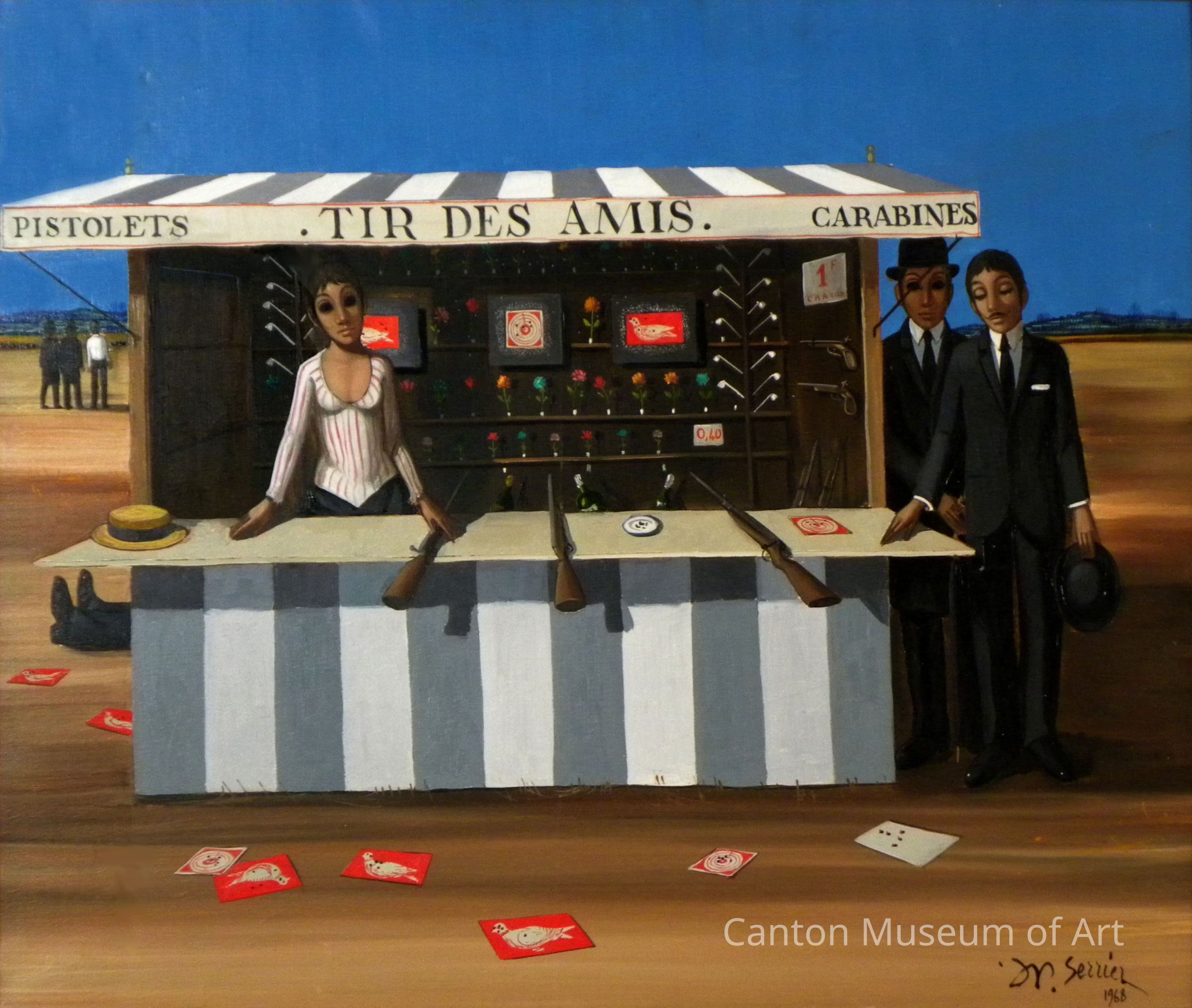 Serrier was a French Surrealist known for his haunting paintings, many with carnival themes. His work focuses on humanity and mortality, inspired by the teachings of Nietzsche (religion and morality) and Freud (subconscious and dreams). Serrier’s characters are void of identity and interchangeable, with