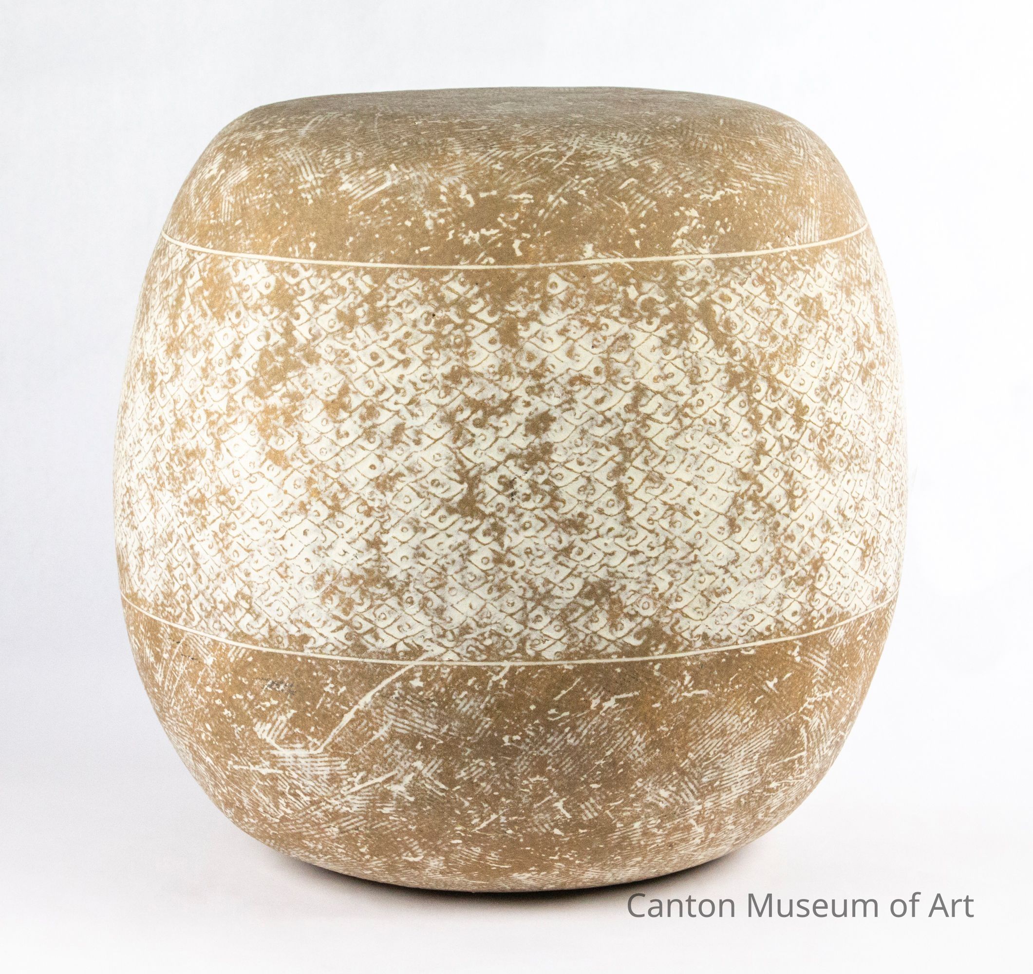 Reminiscent of ancient vessels, Conover decorated the surfaces of his stoneware pieces with cryptic scratches, stripes, and hatchings. He constructed stoneware slabs into pots of various sizes and shapes, each with a unique pattern created by handmade rollers and blades, sometimes finished with clay slip. Most are monochromatic. The vessels were grouped and displayed at ground level, often decorated with willow branches.