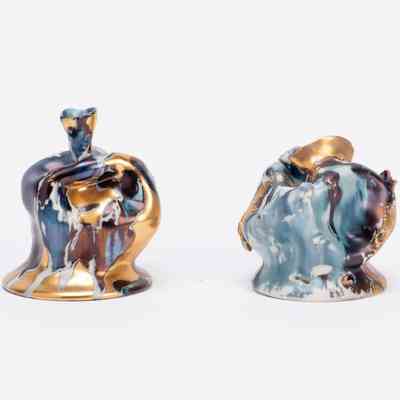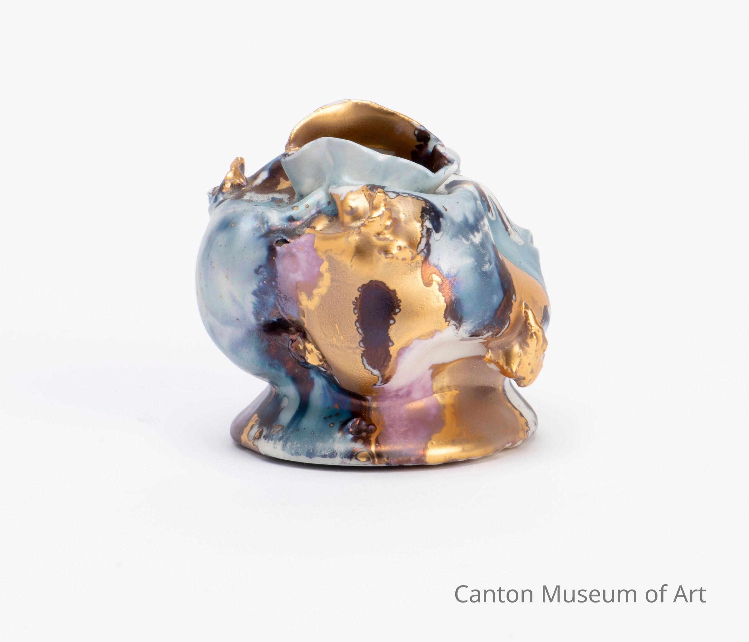 This vessel, one of two in a series titled “Too Sweet”, is named after the daughter of an attendant whom Pilcher and his wife hired to look after Pilcher’s ailing mother during her final years. The decadent pieces, taking the approximate shape and size of ice cream balls, have swirling luster glazes of gold, purple, blue, and white that bleed into each other. Pilcher is known for his decorative works such as these, that are sometimes mistaken for being made of bronze or other metallic materials, in part because the glazes look metallic and in part because many of his forms appear like a thin metal sheet that has been struck hard with a hammer. To get the shape he wants, he works with a drier than usual clay. If the vessels are not shaped quickly, they will absorb moisture from the wheel and collapse. This peril is particularly worrisome in forming pieces with overhangs, as in the "Too Sweet" series. In his work, each bump and dimple is individually crafted, making his work particularly impressive. To facilitate building the vessels’ walls, he has created clay prosthetic extensions to his fingers, which are useful when working in tight spaces. Because of the vessels’ intricate shapes, many of his works are incredibly difficult to execute.
