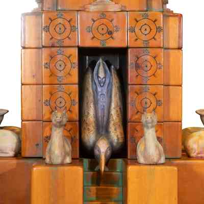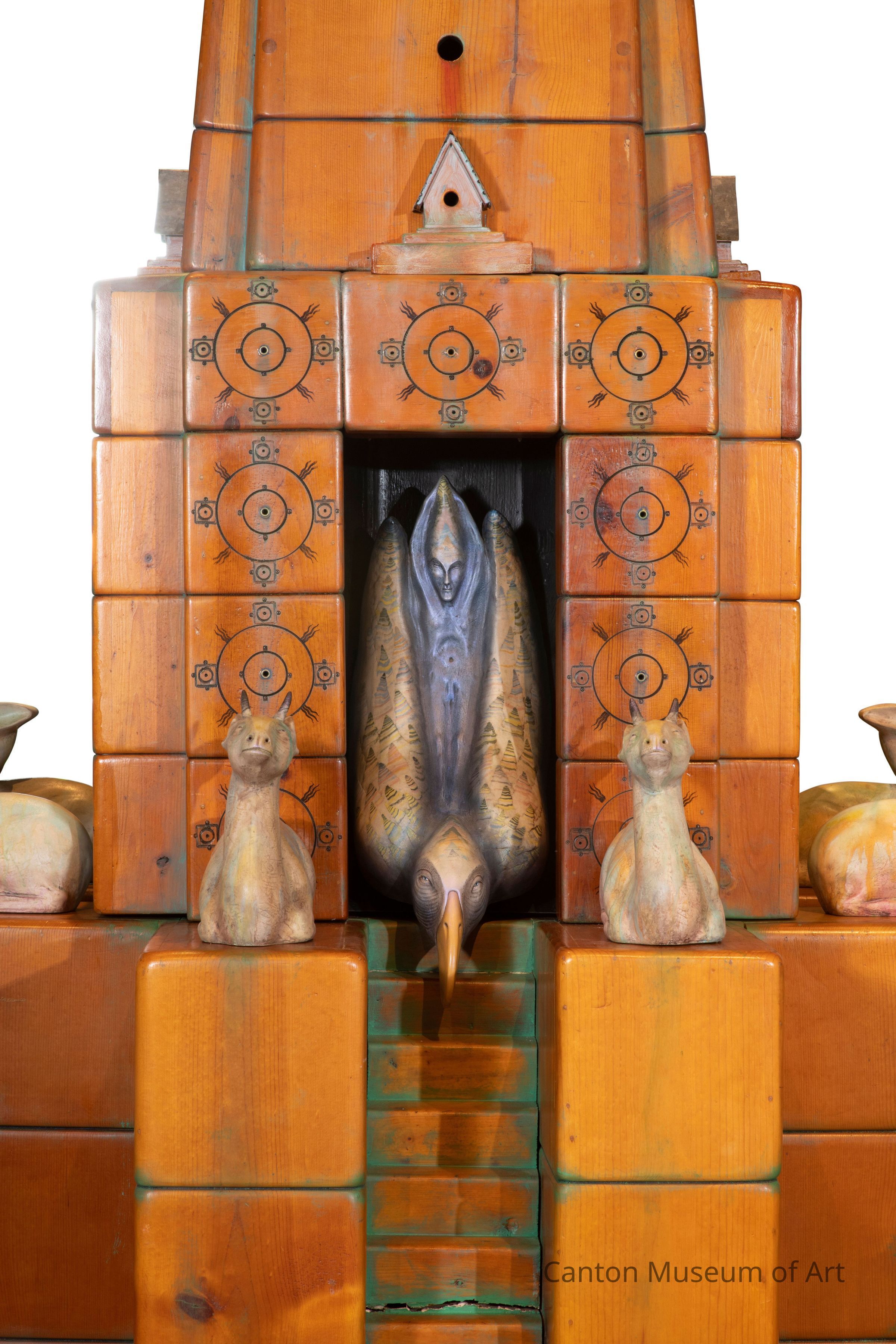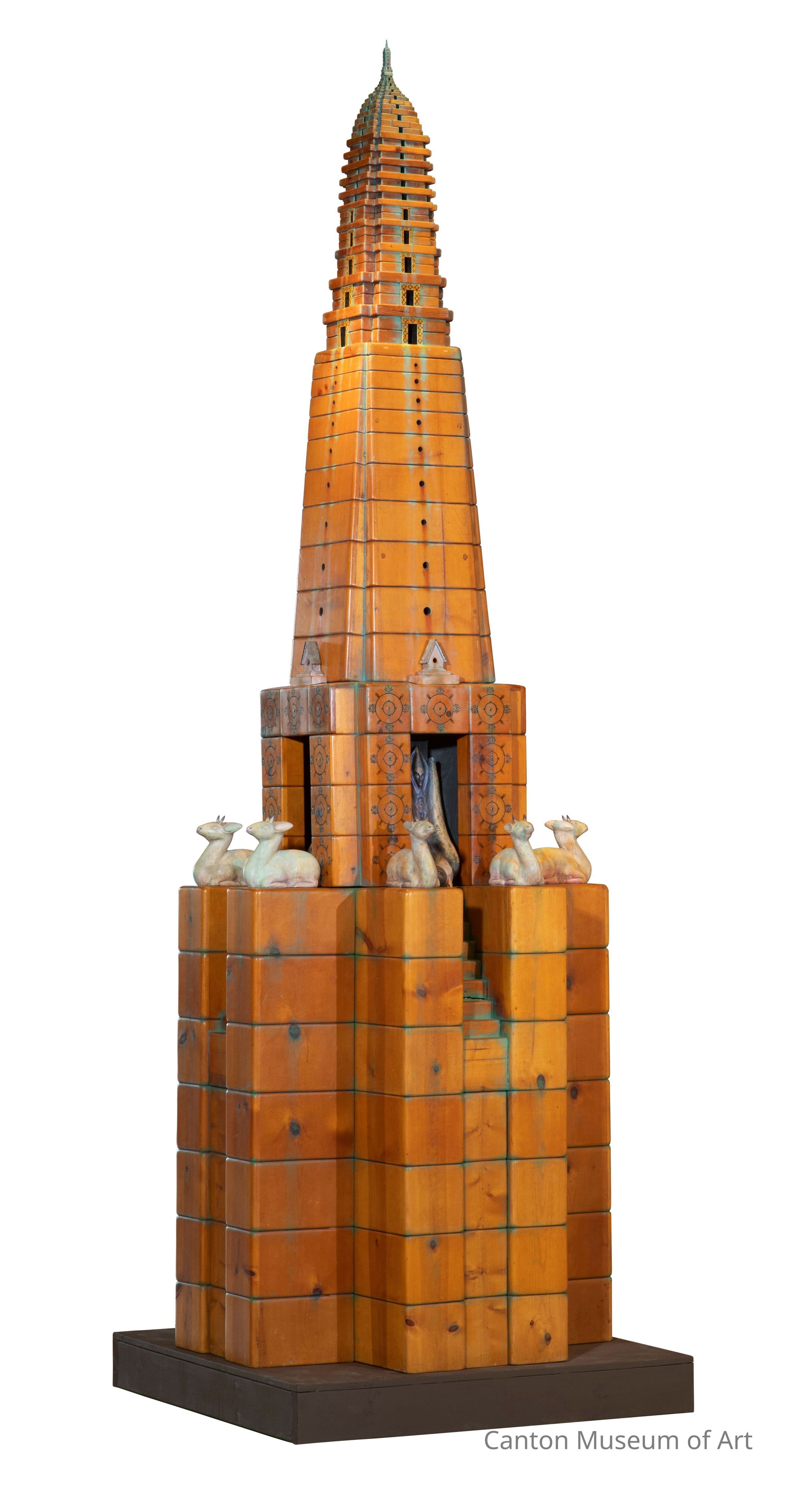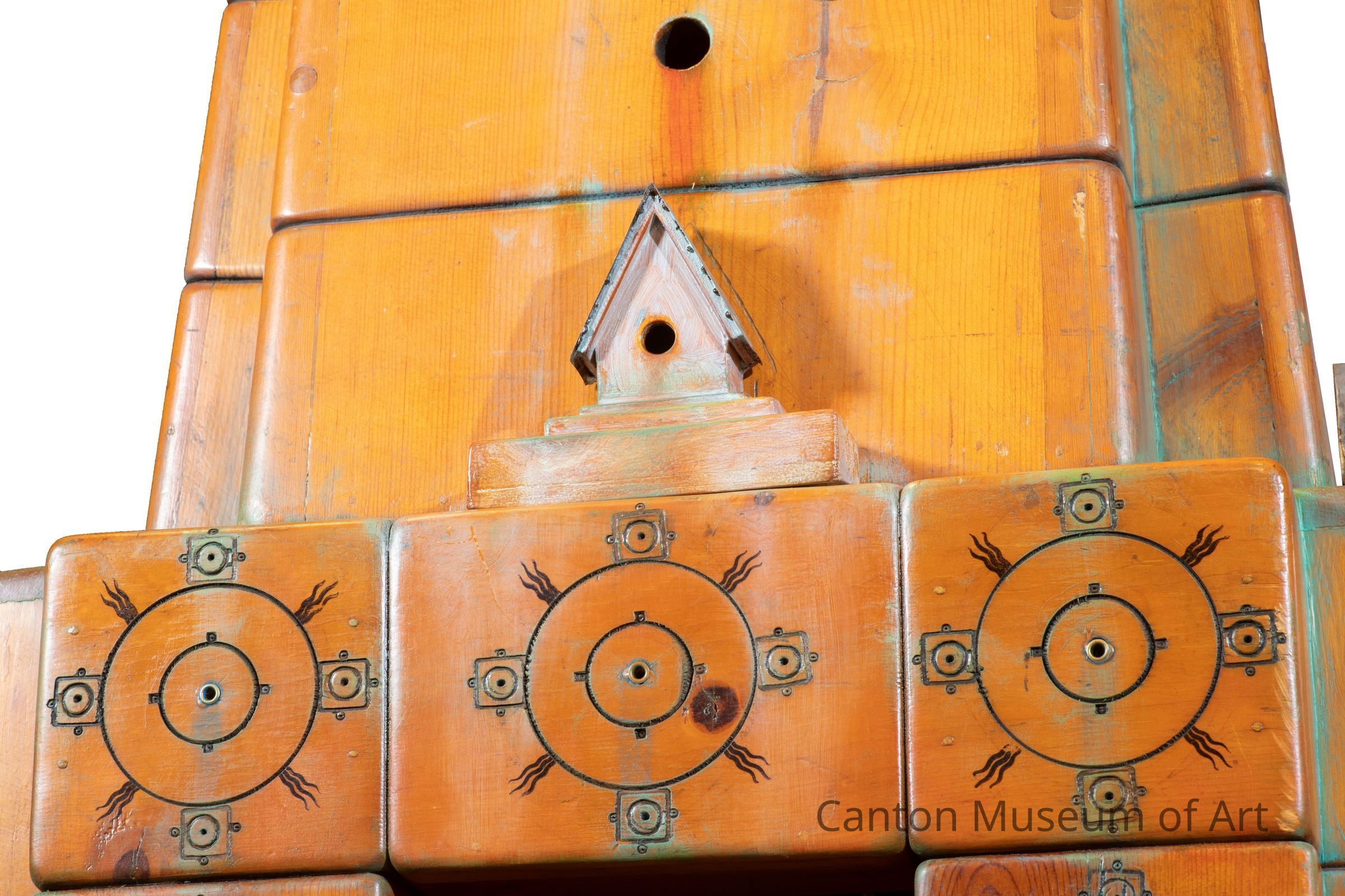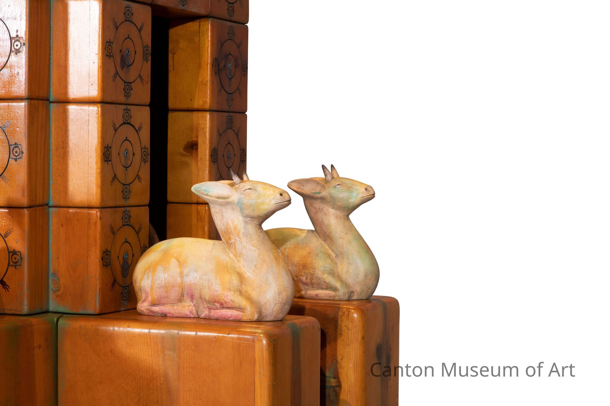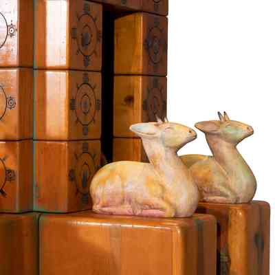 To Spinosa, birds are a connection to heaven, and the doe is a welcoming guardian to the ancestral world. "Tower" reaches up, at a height of 12 feet, to the ancestors that we have lost our connection with.