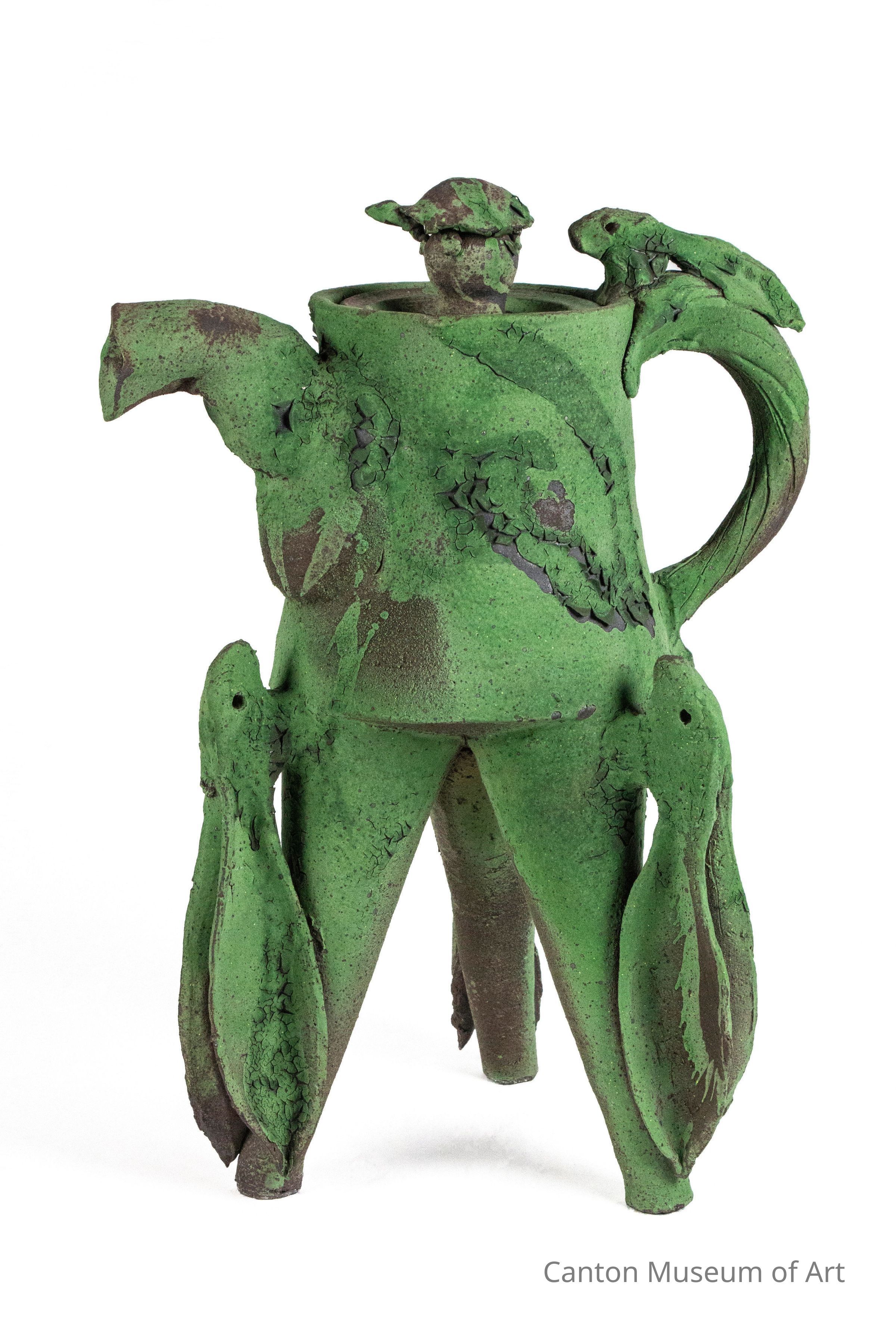 Ferguson frequently used rabbit forms in his work, stretching them to create handles or forming them into the legs of a vessel. In this piece, the ears of the rabbits on the legs are elongated to create an organic look. The chrome slip on this piece suggests both mossy growth and patina, fitting for the theme of nature. In fact, the most repeated themes throughout all of Ferguson’s creations are the use of organic colors and rabbit forms. Animals, especially rabbits, were an important asset as Ferguson segued from functional pottery into more sculptural and personal expression.