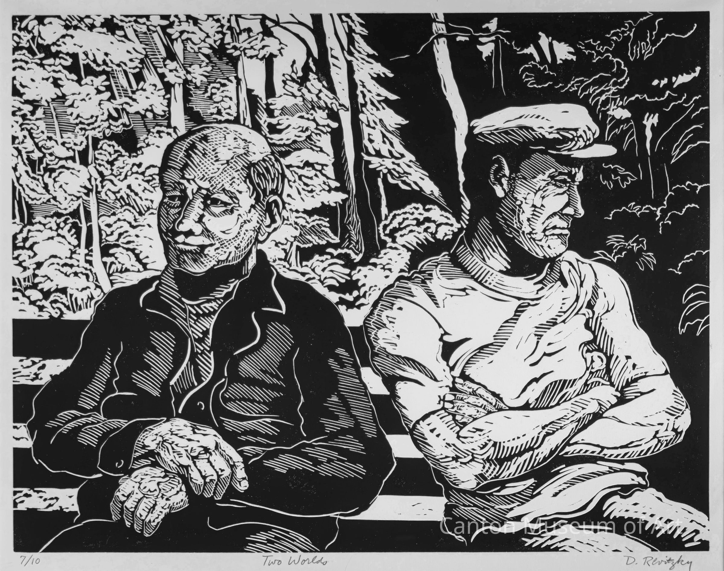 Revitzky mainly works in linocuts, hand-pulling his prints in small editions. His work aims to evoke a feeling of mystery, where the familiar is recognized, yet some aspects seem a little strange. He also wishes to convey the unique, spiritual elements of nature. "Two Worlds" achieves the familiar with its imagery of two men on a bench outside, but upon closer inspection the strange, surreal elements begin to emerge through the landscape. "Two Worlds" is concerned with human nature, specifically how some people perceive their lives to be enjoyable, exciting, and mostly filled with light, while others, for one reason or another, perceive them with more gloom and experience them as harsh and dark.